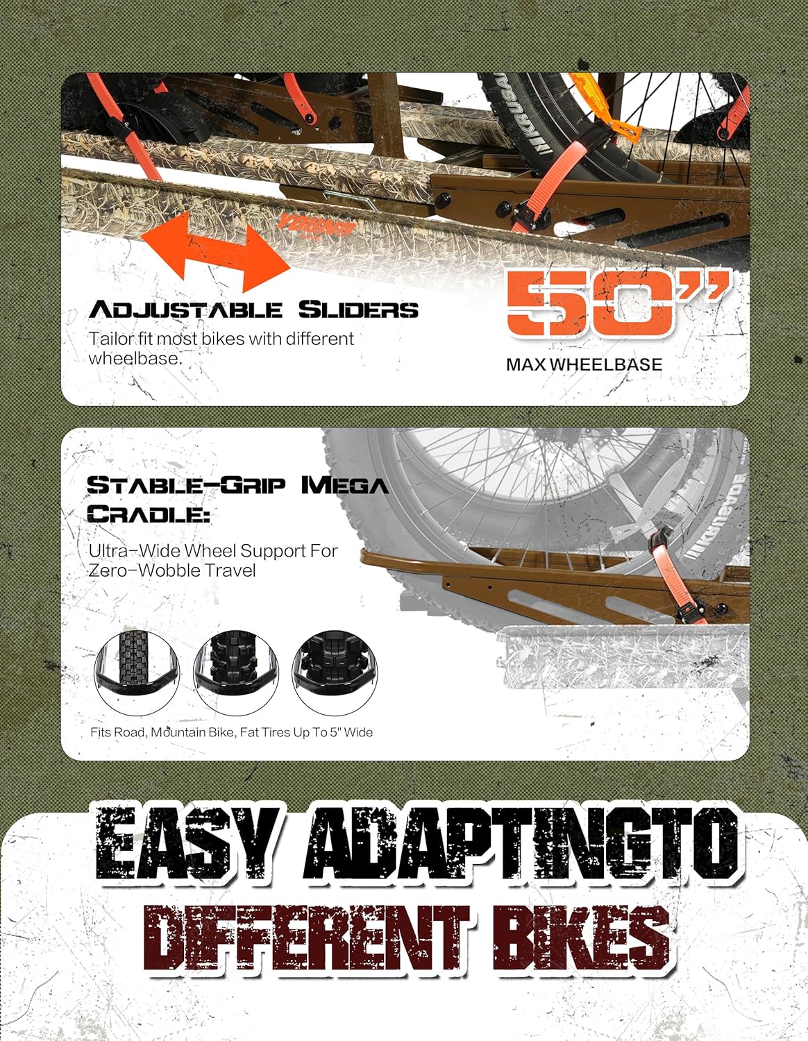 - ăHeavy-Duty & Secureă Supports up to 200 lbs total weight. Features a 3-point locking system, anti-wobble technology, and ultra-wide wheel cradles. Adjustable arms and sliders fit most bikes, including fat tires up to 5" wide and 50" wheelbase.
