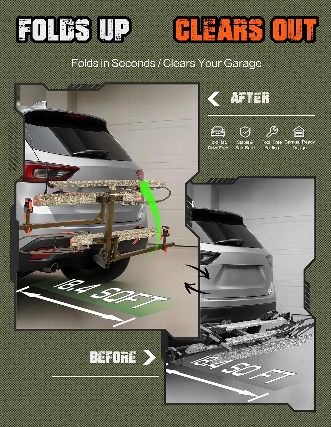 - ăEffortless Loading & Space-Savingă Built-in ramp enables smooth roll-on bike loading. Quick-release, foldable frame saves garage space and folds flat in seconds. Tool-free setup makes it easy to get ready for your next trip.