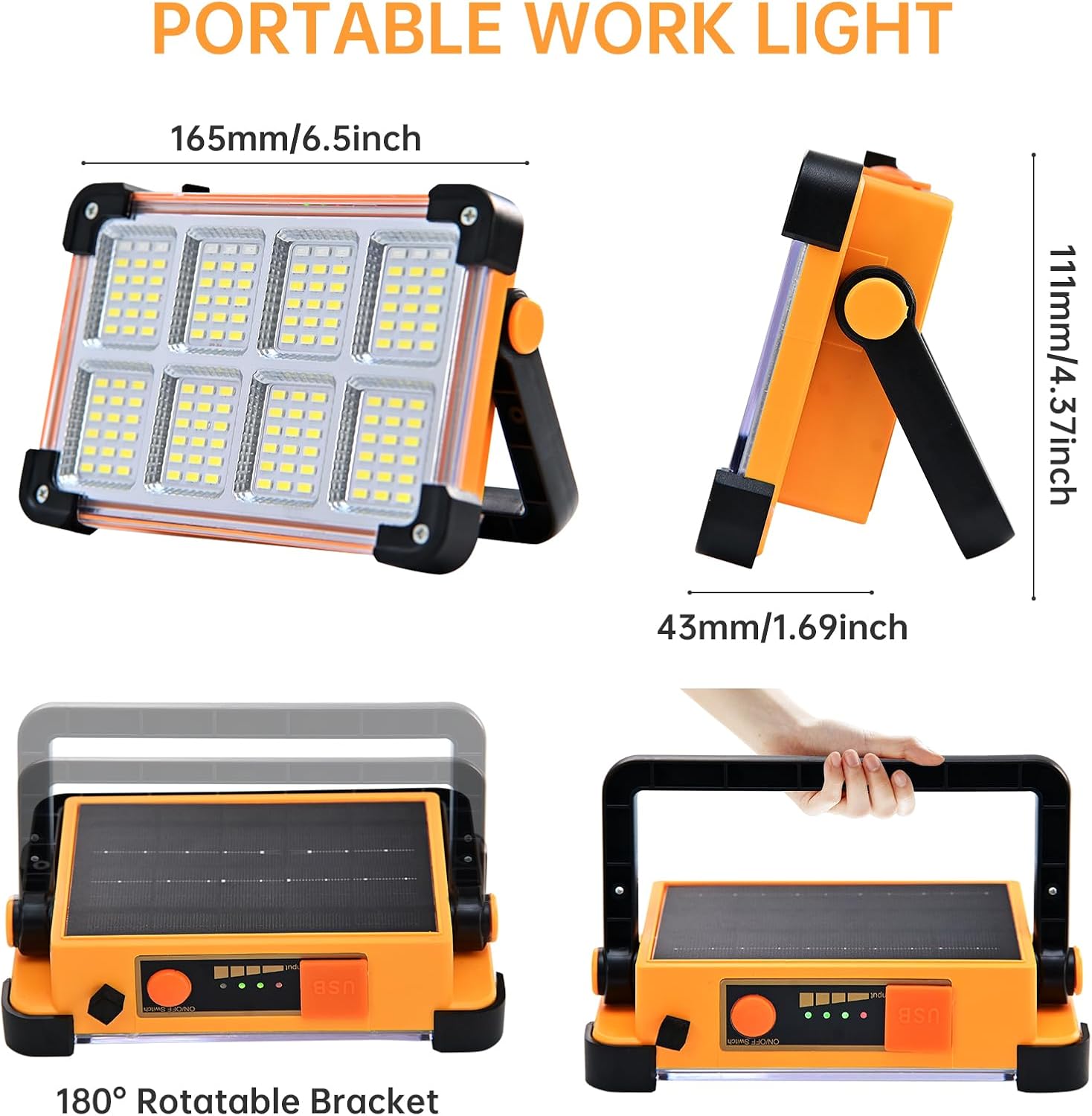 - 【10,000 Lumen High Brightness & 4 light modes】 Convenient solar worklight is equipped with 144 LED beads, which can provide up to 10,000 lumens output, easily illuminating large work areas; Rechargeable camping light has 4 light modes, high brightness, medium brightness, low light, red and blue blinking, short press on the power button can be switched, and long press to turn off, in order to meet the needs of your different occasions.