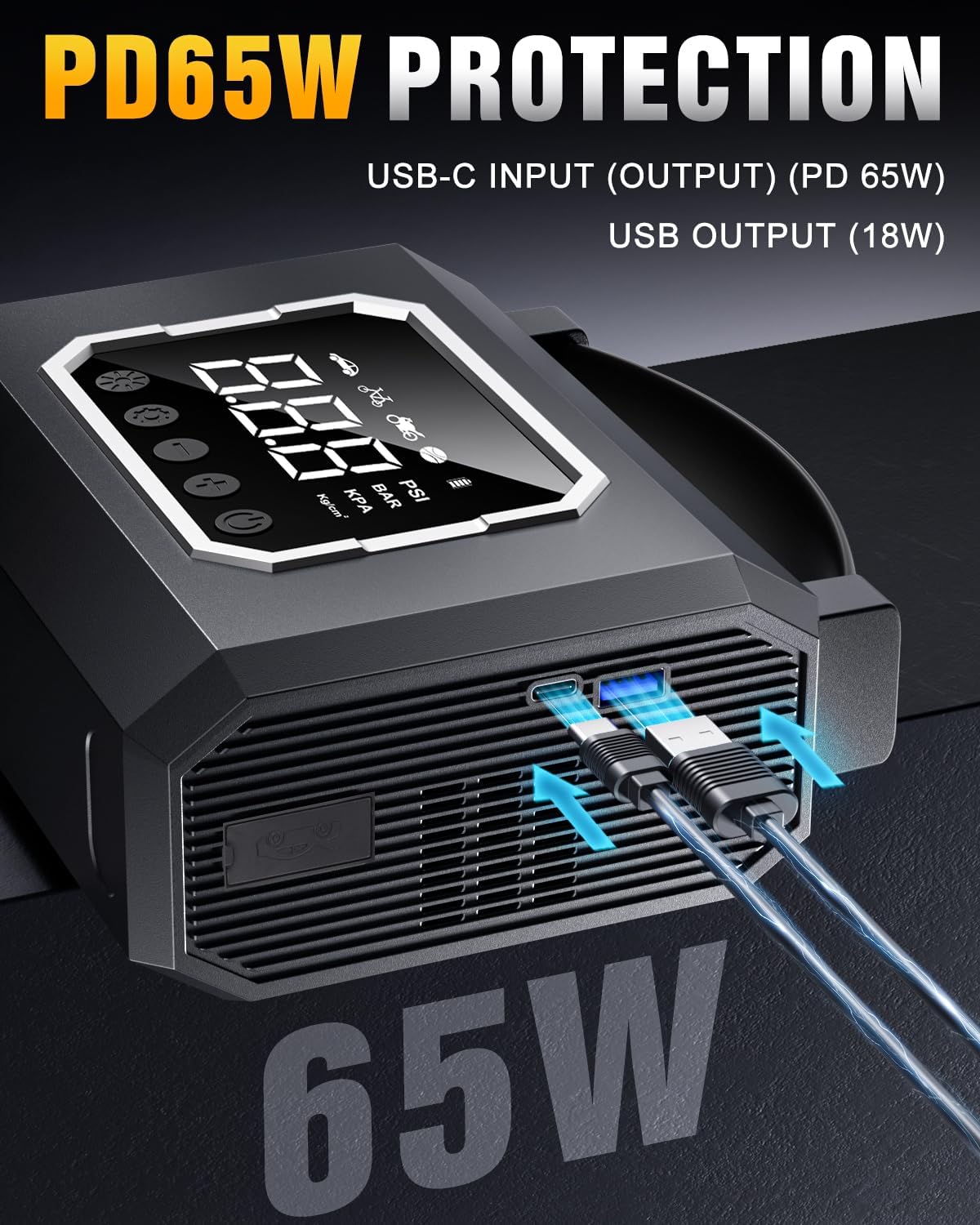 - 65W USB-C FAST CHARGING POWER BANK: This versatile unit also functions as a 65W USB-C power bank. Equipped with a 65W Type-C input/output port and a QC3.0 USB-A port, the car battery charger can rapidly charge smartphones, tablets, laptops, GPS units, cameras, headphones, and more. Includes a PD65W fast charger, delivering charging speeds up to 75% faster than standard chargers—perfect for powering your devices on a road trip.