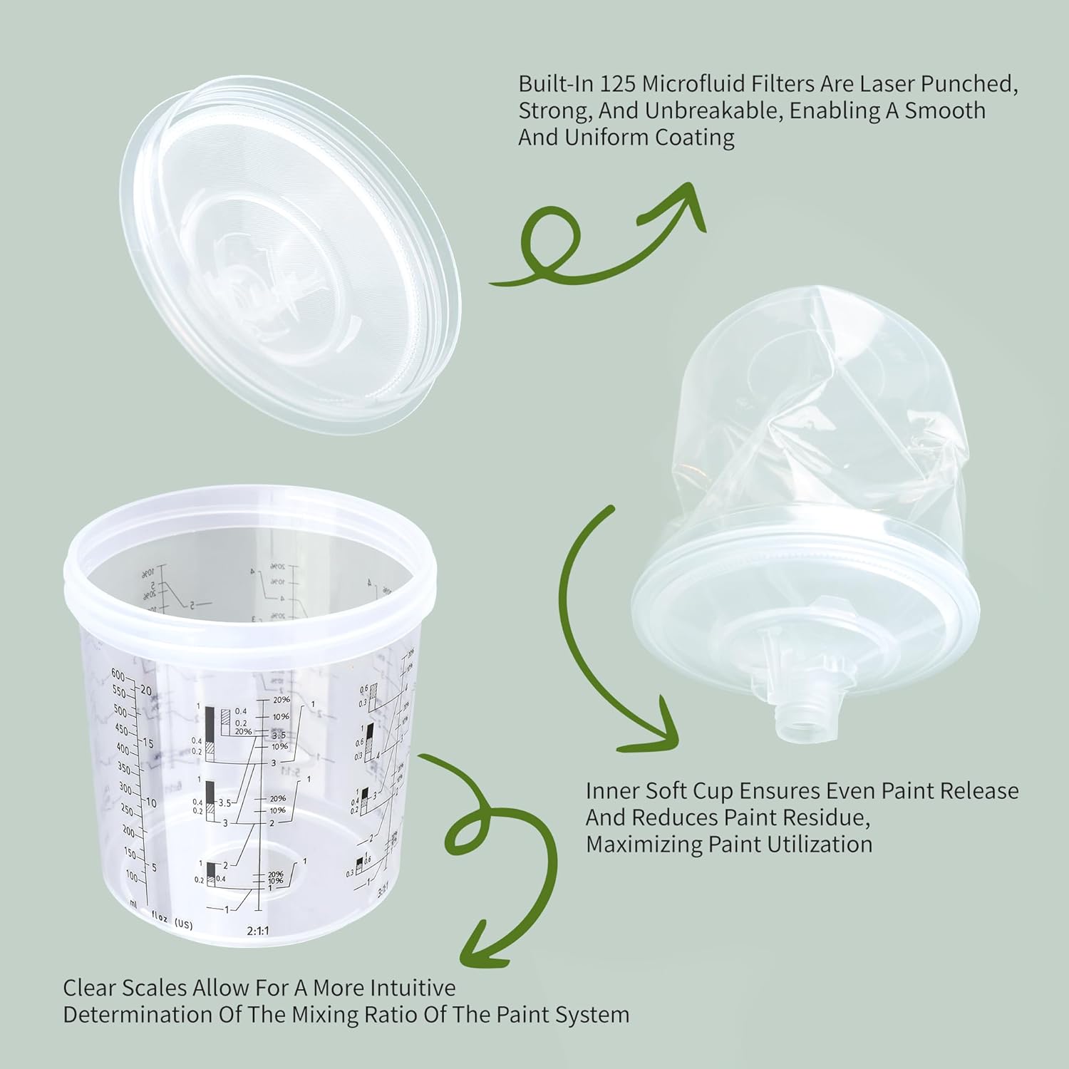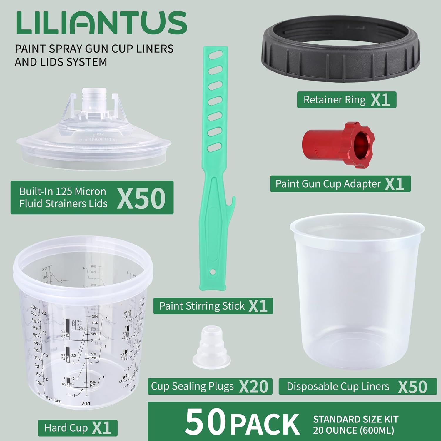 - - Package Includes: The Liliantus disposable paint cups set contains 50 disposable paint spray gun cup liners at 20 ounces (600ml), 50 lids with built-in 125-micron fluid strainers, one mixing cup adapter with hard cup and retainer ring, 20 cup sealing plugs, and one paint stirrer.