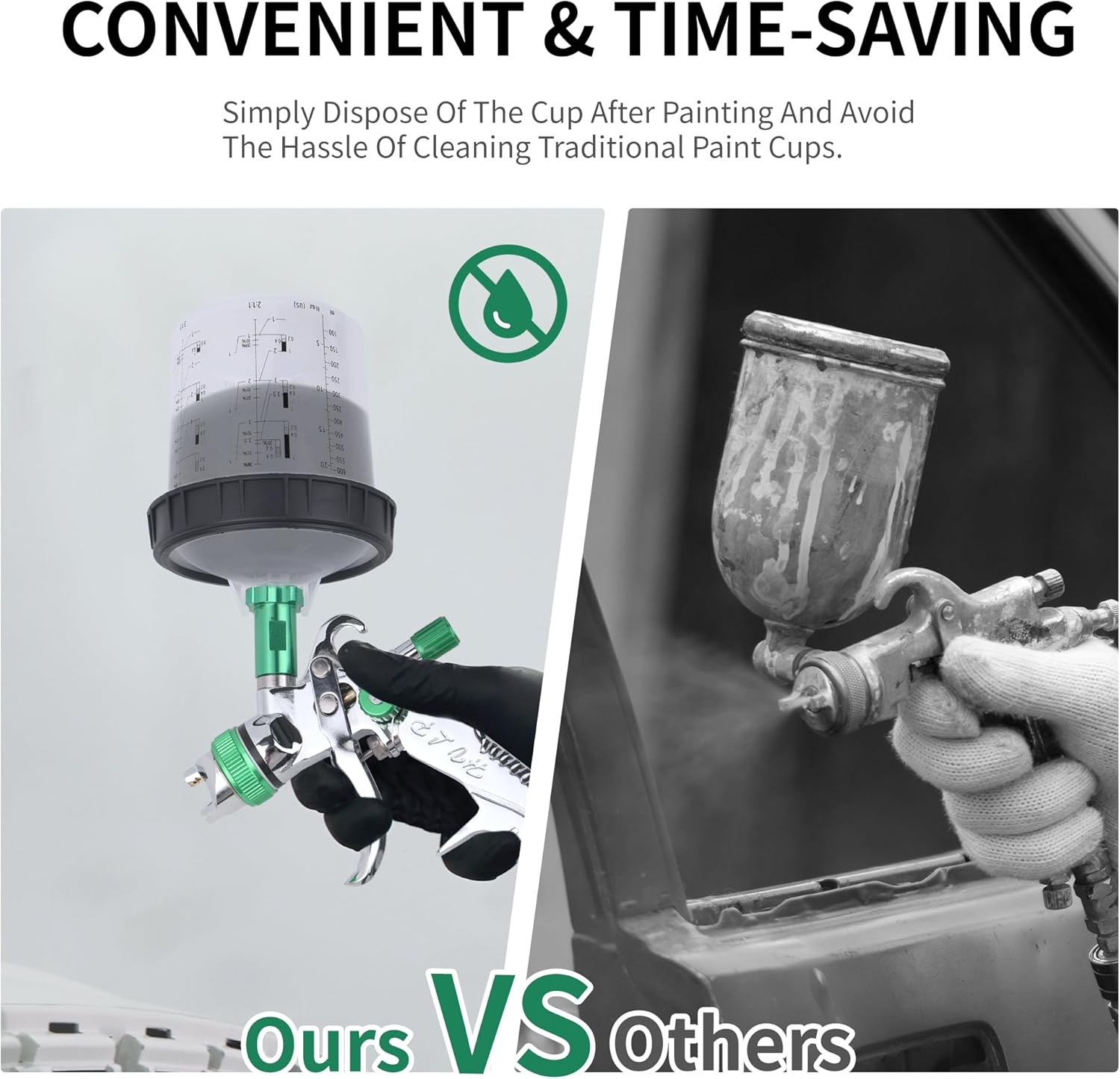 - - Easy to Use: Our disposable paint gun cup set has only three parts, making it very easy to install. With clear graduations and mixing ratios for common paint systems, the liquid level is easy to see, and they are suitable for almost any spray gun.