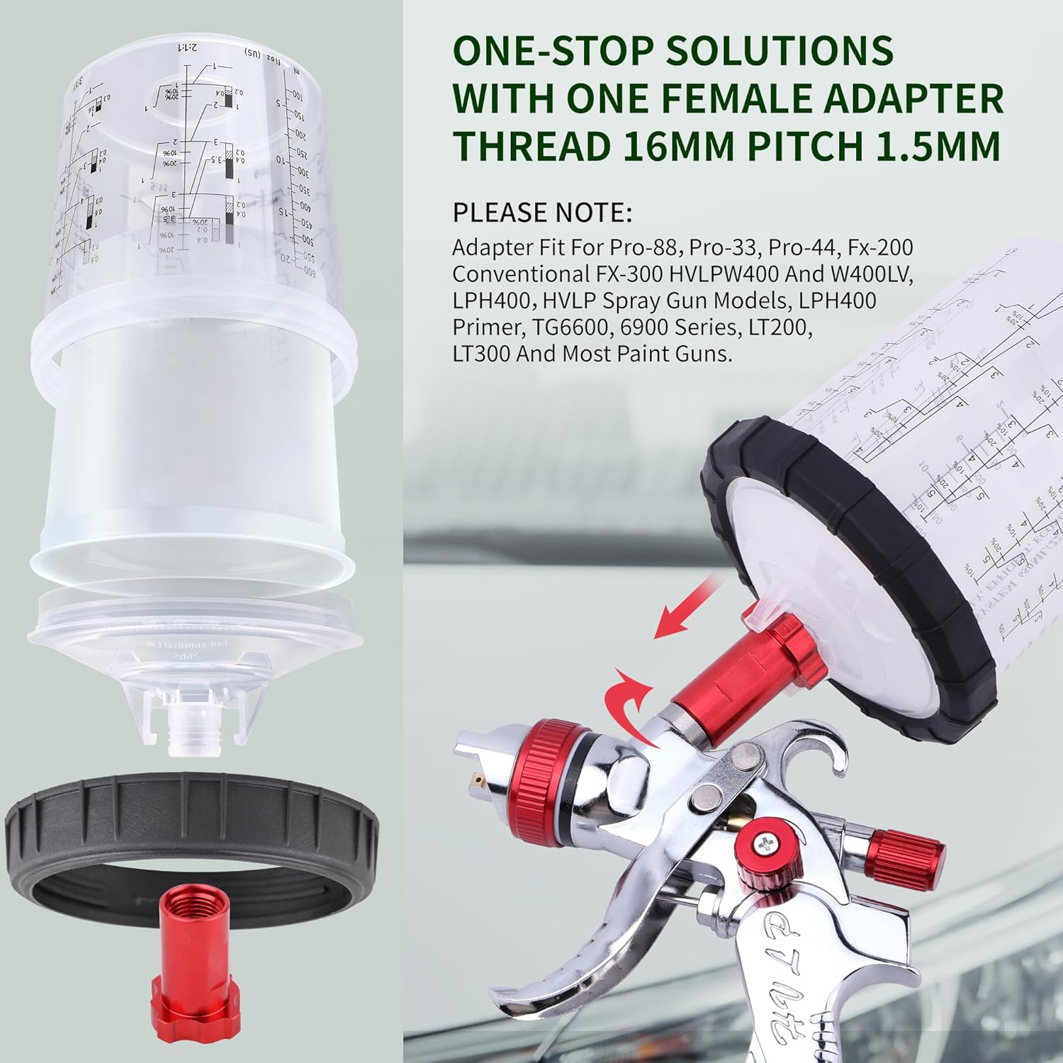 - - PLEASE BE INFORMED this included cup adapter has a thread size of 16mm and 1.5mm pitch, fits for LPH400 Models W400 W400LV LPH440 Primer TG6600 6900 Series LT200 LT300 FX-200 Conventional FX-300 HVLP,PRO-33 PRO-44 PRO-88 HVLP paint spray gun Models and more. If this adapter doesn't fit your specific spray gun, our disposable paint cup kit remains a highly cost-effective alternative.