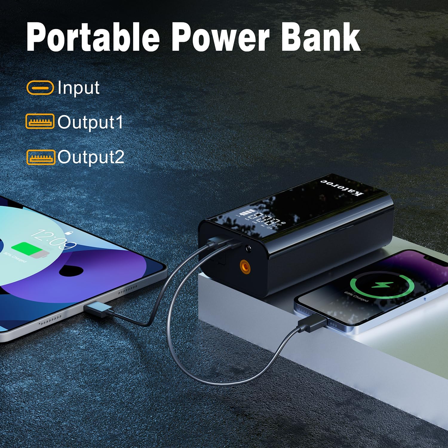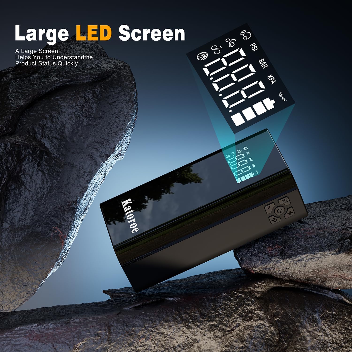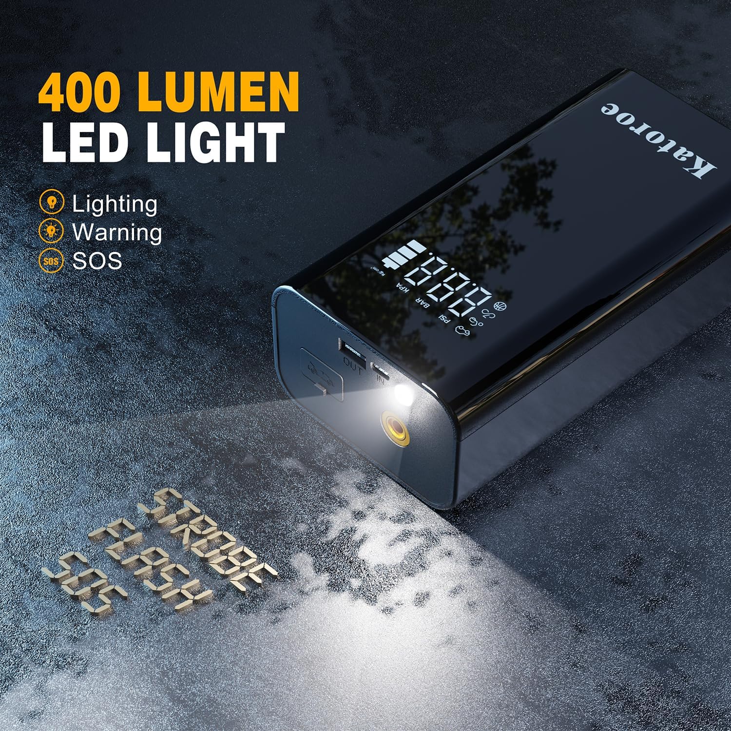 - 【10-IN-1 JUMP STARTER】Car battery jump starter can jump start max up to 80 times on a single full charge.It also have 10 practical function: such as jump starter, tire Inflator, power bank, screen display, tire pressure detection, unit switching, 3-mode lights (Flashlight, SOS, Strobe). In addition, the display screen will show real-time data, making it convenient to start the car and tire inflate.