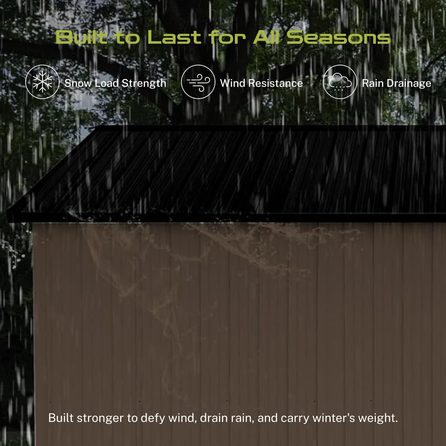 - 【Ultra-Durable for Harsh Climates】Constructed with 24/34-gauge galvanized steel, this weatherproof garden shed resists rust, 6 Beaufort winds (24-30mph), and heavy snow, ensuring a 10-year lifespan in coastal or snowy regions