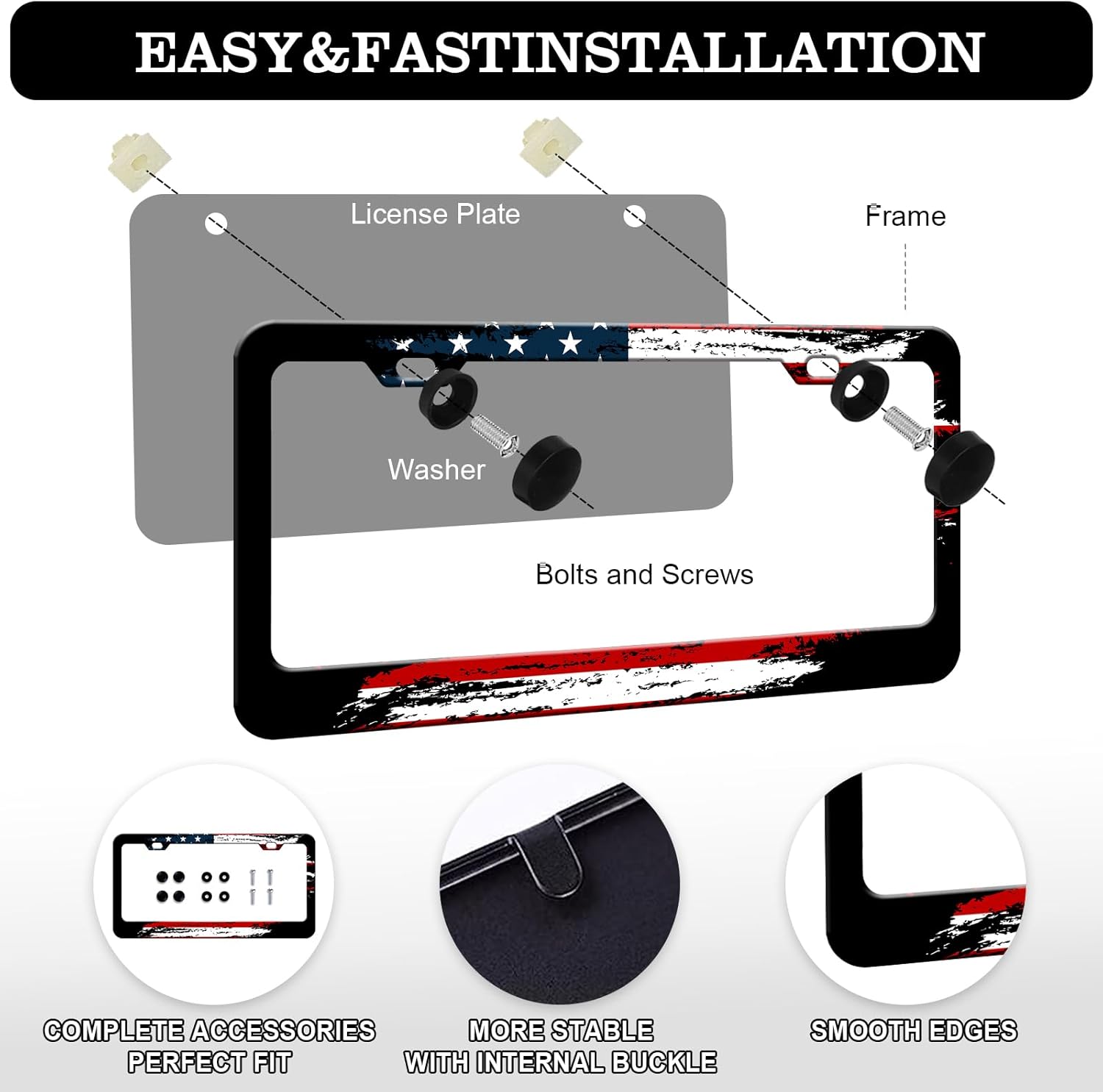 American Flag License Plate Frames - 2 Pack Vintage US Flag Stainless Steel License Plate Holder,Rust-Proof Waterproof Car Decorative Tag Frame with Screws Fasteners Caps