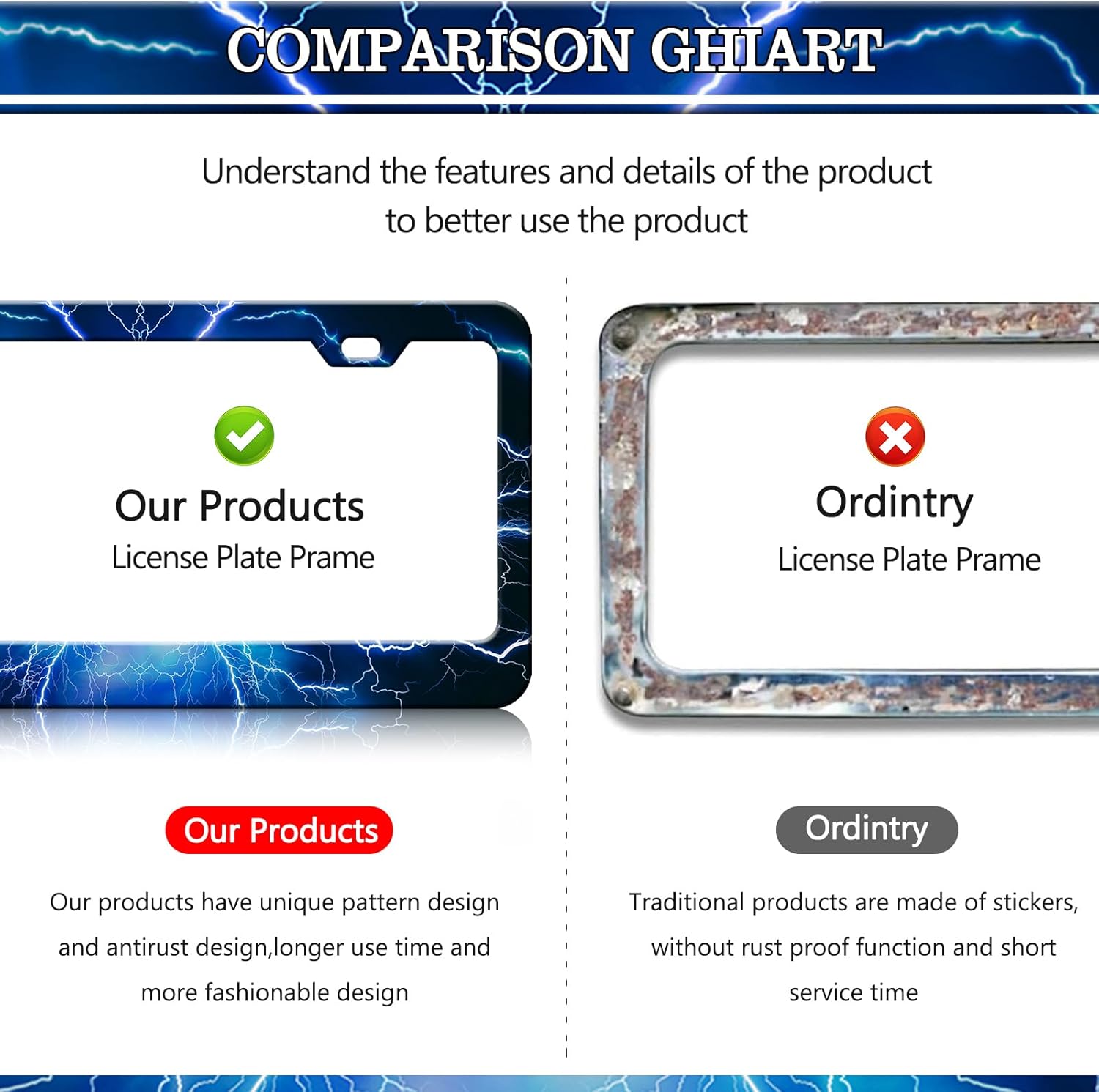 Blue Lightning License Plate Frames - 2 Pack Blue Thunder Stainless Steel License Plate Holder,Rust-Proof Waterproof Car Decorative Tag Frame with Screws Fasteners Caps