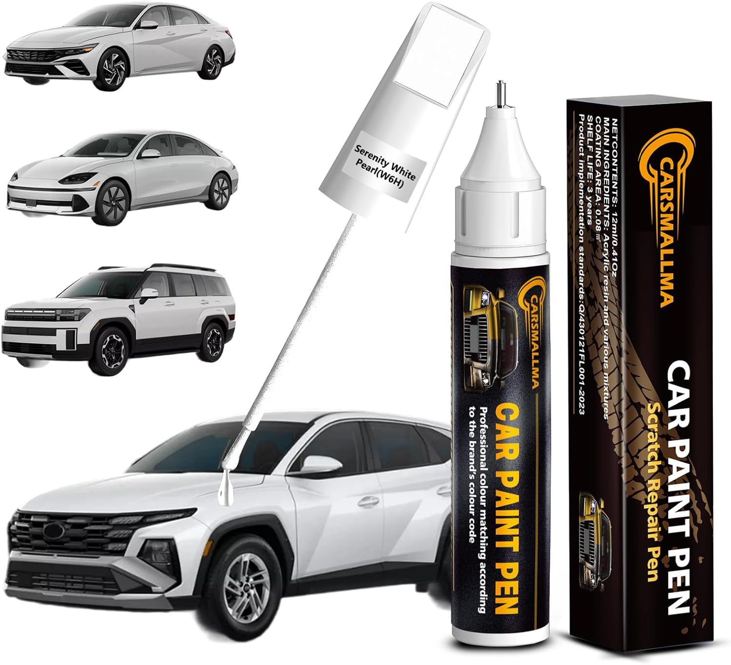 - Exact Color Match: Carsmallma car touch up paint(W6H Serenity White Pearl) is expertly formulated for Hyundai vehicles, including Car/I30/Fastback/Nexo/Ioniq/6/Santa/Fe/Hybrid/I30/Santa/Fe/Sonata/Sonata/Tucson and more. The automotive paint is meticulously crafted and rigorous testing to match the original factory finish, making scratches, chips and peeling paint hardly noticeable. Whether on bumpers or body surface, it delivers a perfect finish