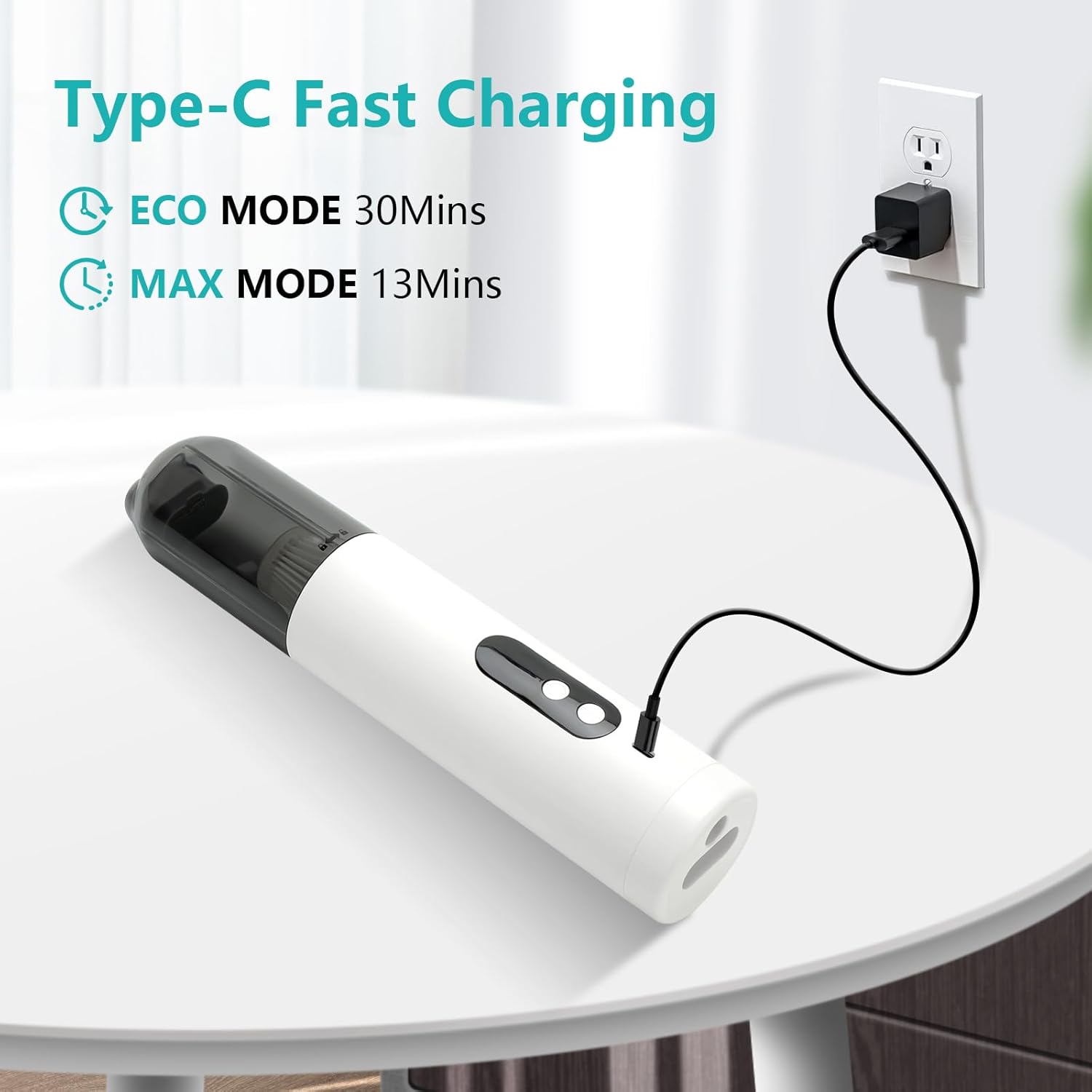 - [Cordless Rechargeable Vacuum Cleaner] This handheld cordless vacuum comes with a Type-C charging cable, compatible with USB car chargers and power banks. After a full charge, it offers 30 minutes in Eco Mode and 13 minutes in Max Mode. Always ready for use, this portable, rechargeable car vacuum ensures you can clean on the go, no matter where you are.