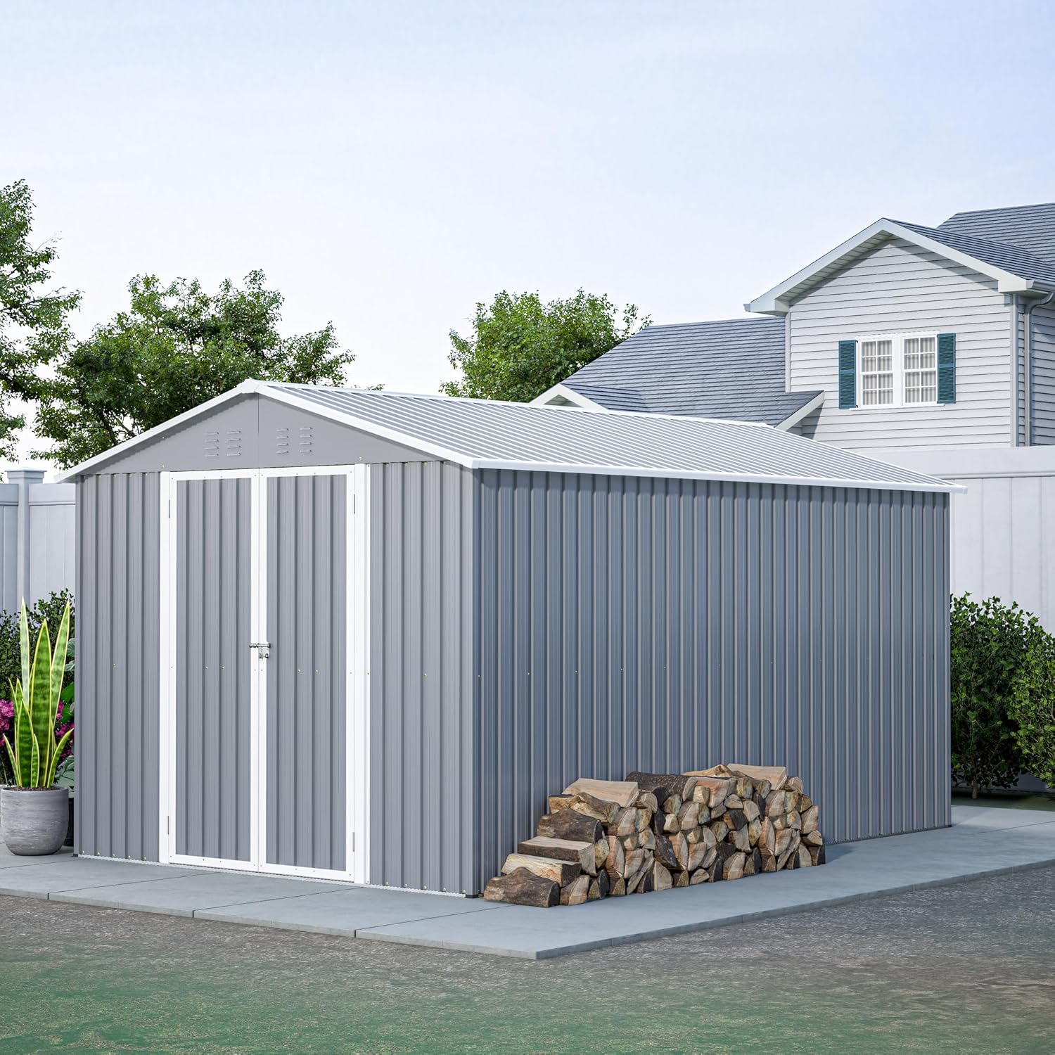 - 【Lockable Metal Door for Secure Storage】 This metal shed is equipped with hinged door and includes padlock for enhanced security. The lockable design helps safeguard your gardening tools, bikes, and outdoor supplies, while the wide door opening (42.76" W x 64.25" H) allows easy access.