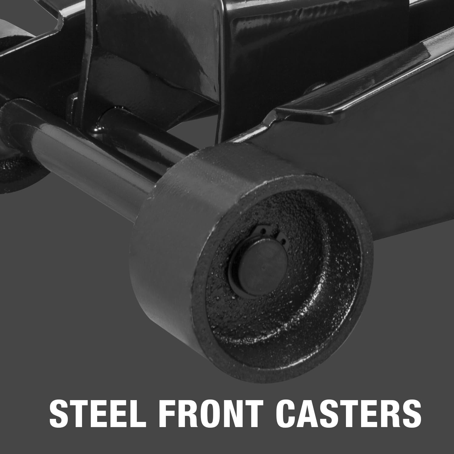 - 4 Wheels and A Long Detachable Handle: Equipped with two steel front casters, two 360 degree rear casters and a long detachable handle, so that the floor jack can move freely and fixed in a certain position to work.