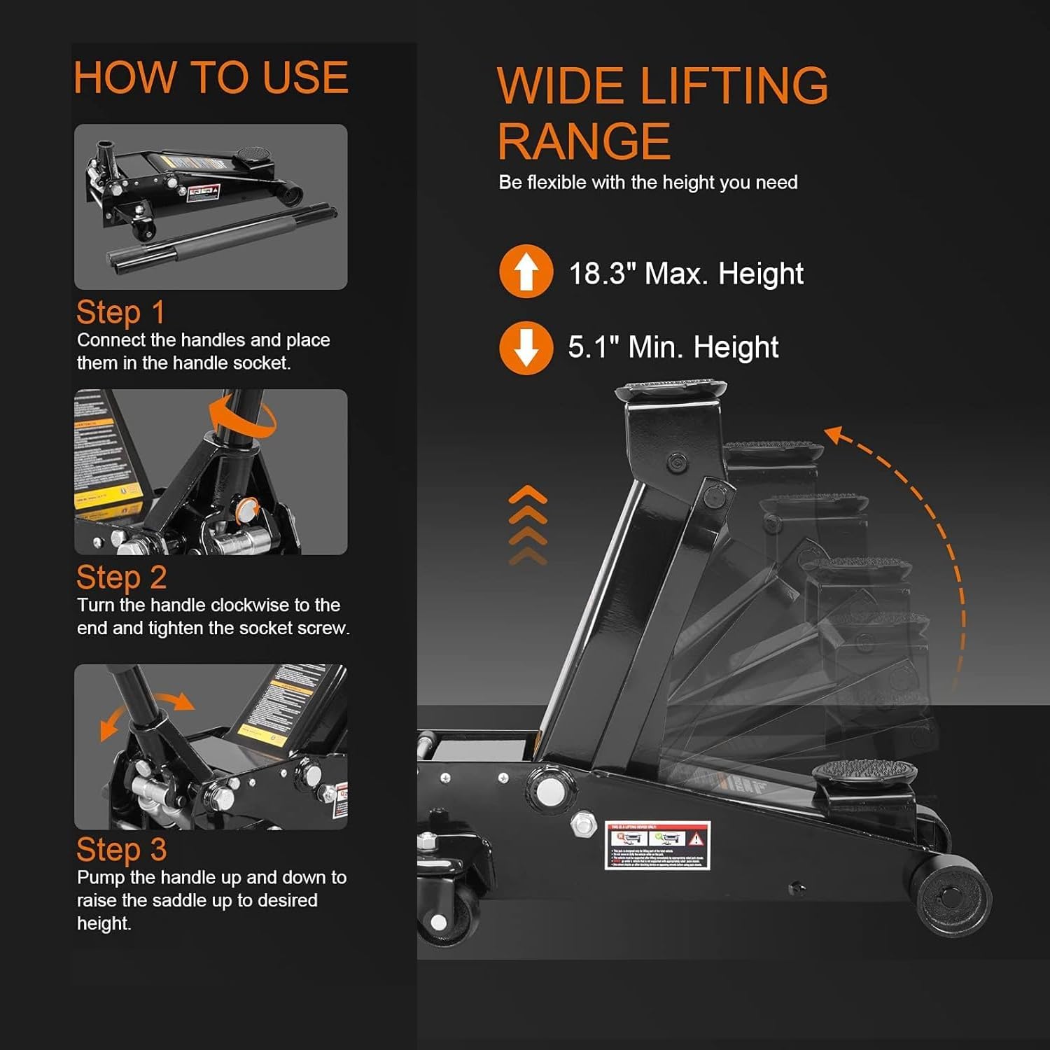 - Hydraulic Car Jack: 3 ton floor jack with a minimum lifting height of 5.12" and a maximum lifting height of 18.31". It can reach the height desired by the user in a short time.