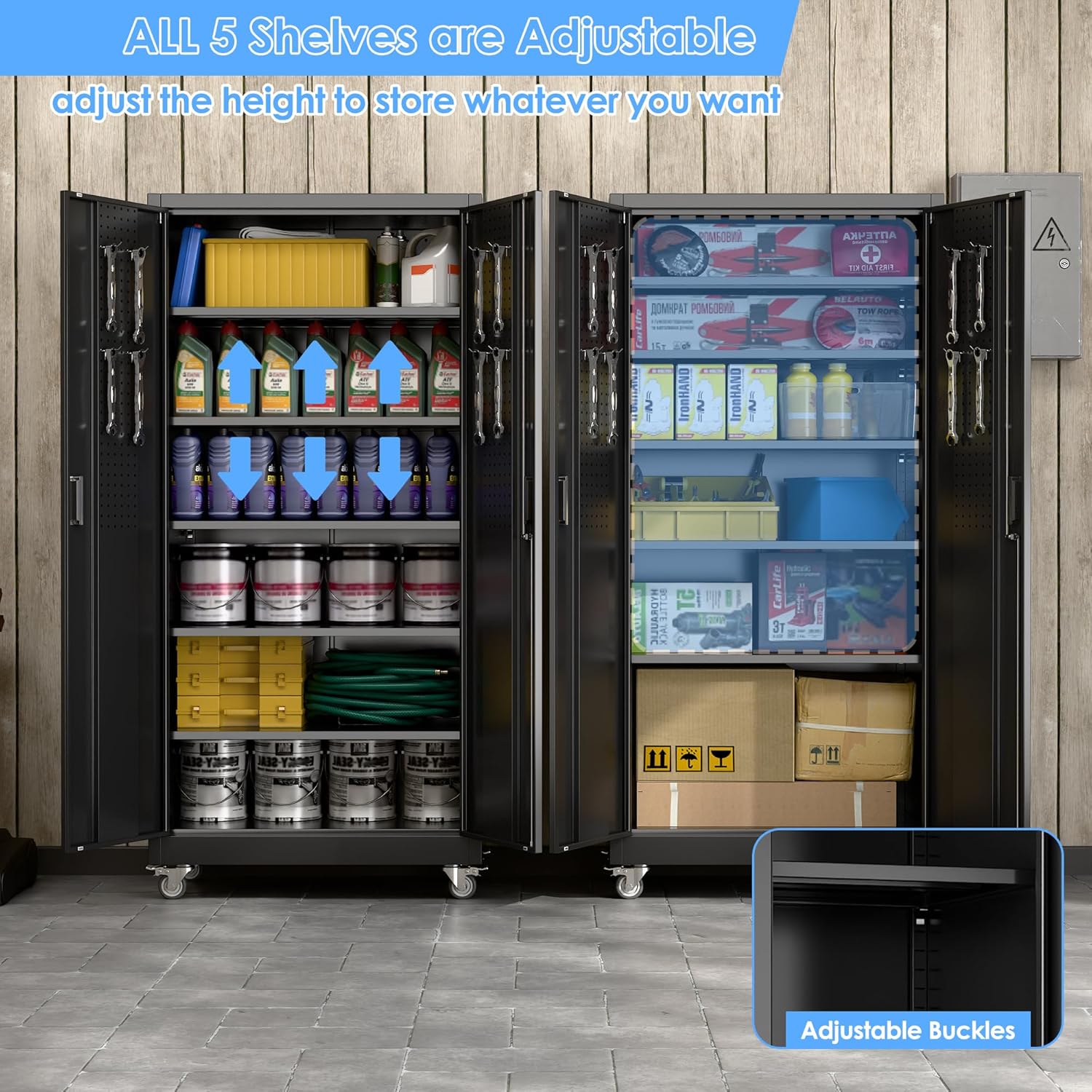 - Ample & Flexible Storage Solutions: Maximize organization with 5 adjustable shelves (customizable height) and pegboard on both doors, paired with 4 hooks for hanging tools, accessories, or gear. This design of the garage storage cabinet with wheels adapts to your needs, whether storing heavy-duty items or small essentials;