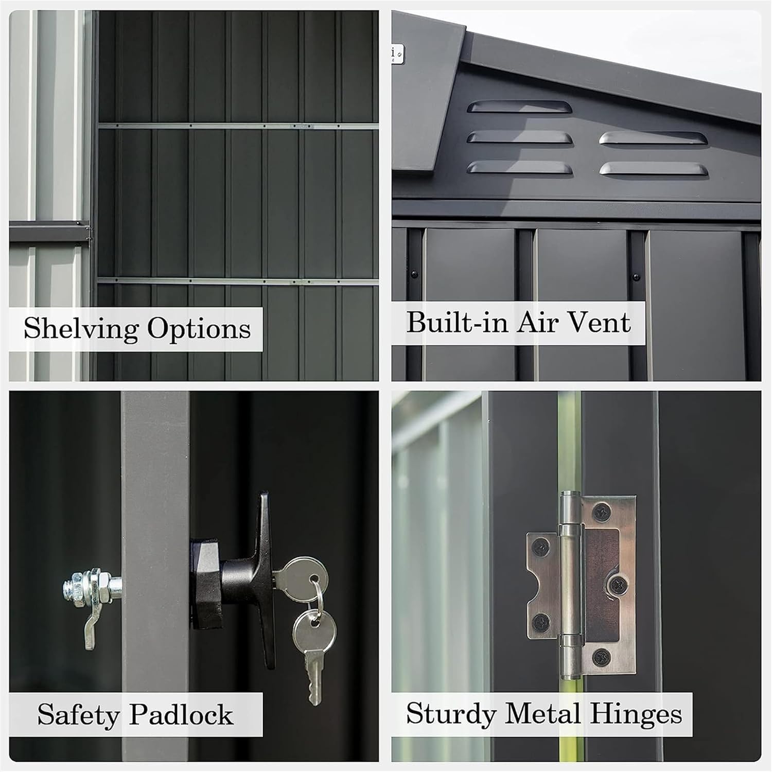 - Spacious & Organized Storage Capacity This shed provides ample space for lawnmowers, bicycles, patio furniture, and more. The intelligently designed interior accommodates shelves or hooks (not included), while wide double doors ensure easy access for bulky items. Say goodbye to cluttered garages and hello to a neatly organized backyard