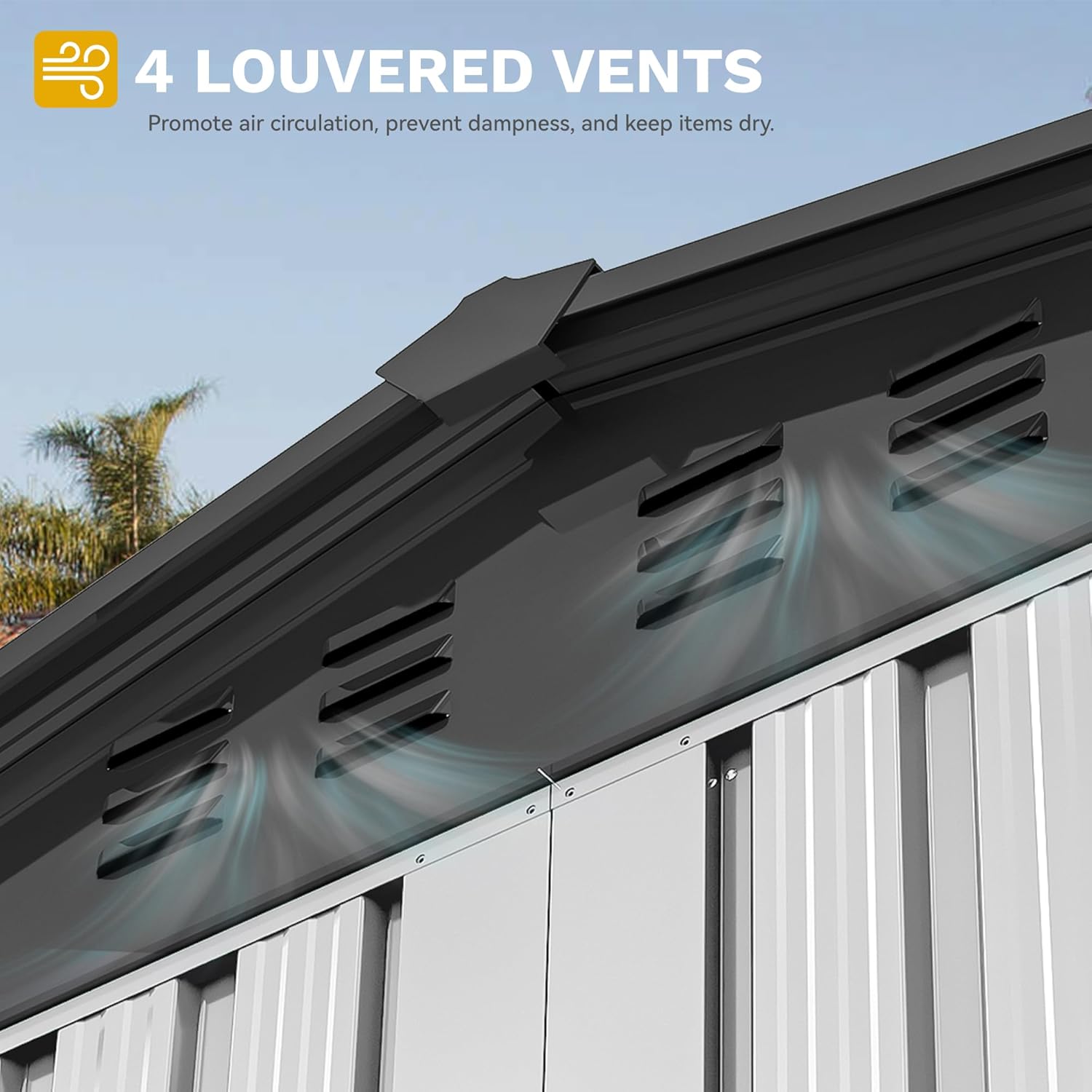 - Effective Ventilation & Sloped Roof: Strategically positioned ventilation vents and a sloped roof in our backyard storage shed eliminate humidity and promote airflow, preventing water accumulation and safeguarding your tools
