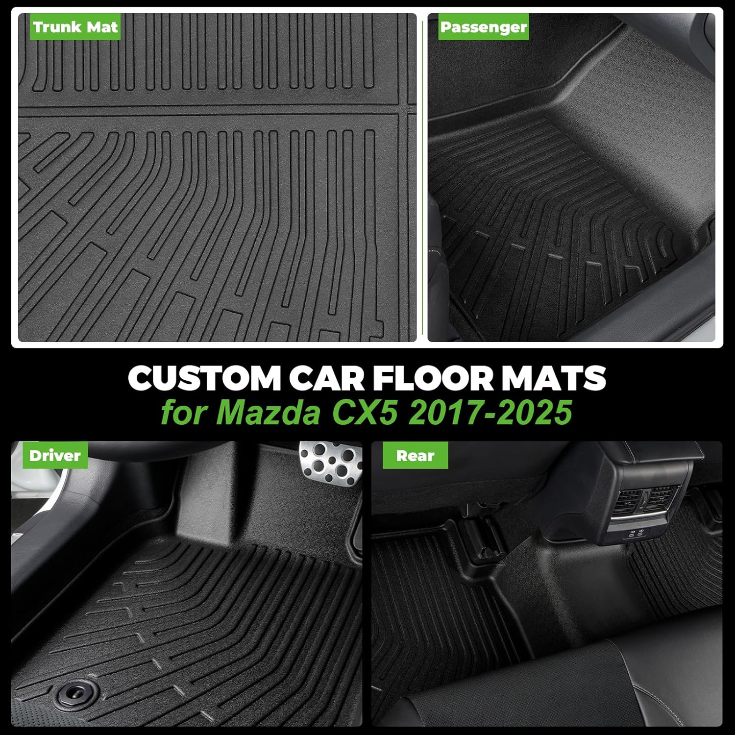 - ăPrecise FităSuitable for Mazda CX5 2025 2024 2023 2022 2021 2020 2019 2018 2017,all-weather floor mats and cargo mats. Through 3D laser sanning technology, accurately cover your car carpet and fit your car like a glove. During the design process, attention was paid to details such as throttle and brakes, which will not affect your driving experience.