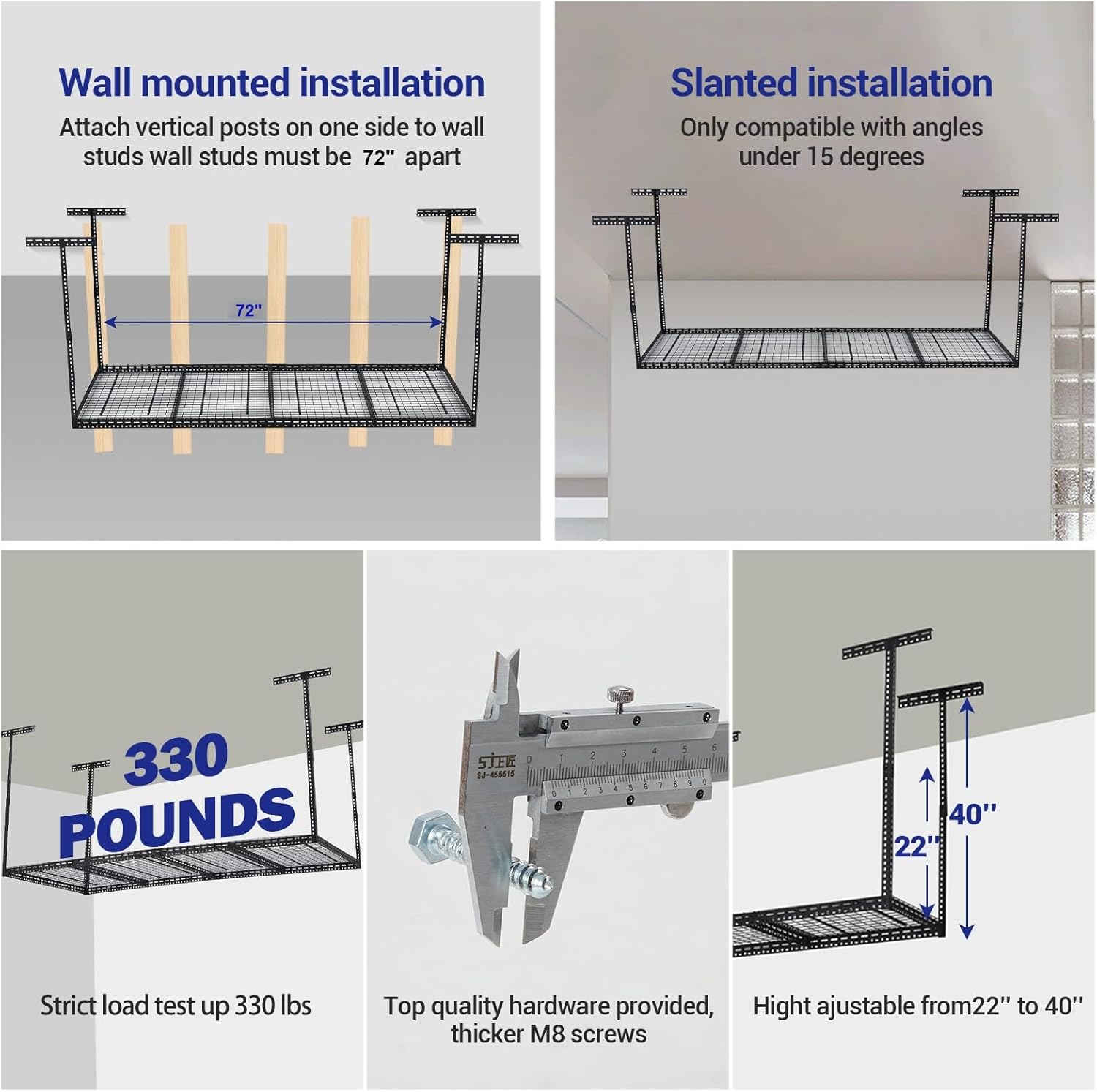 - ā 330LB Heavy-Duty Capacity: Engineered with industrial-grade cold-rolled steel & reinforced wider bars, this garage storage rack securely holds up to 330lbs. Important: Distribute weight evenly using two wooden boards. Thick M8 bolts and extra mounting holes prevent shaking, making it ideal for bulky garage, attic, or shed items like tires, bins, and tools.