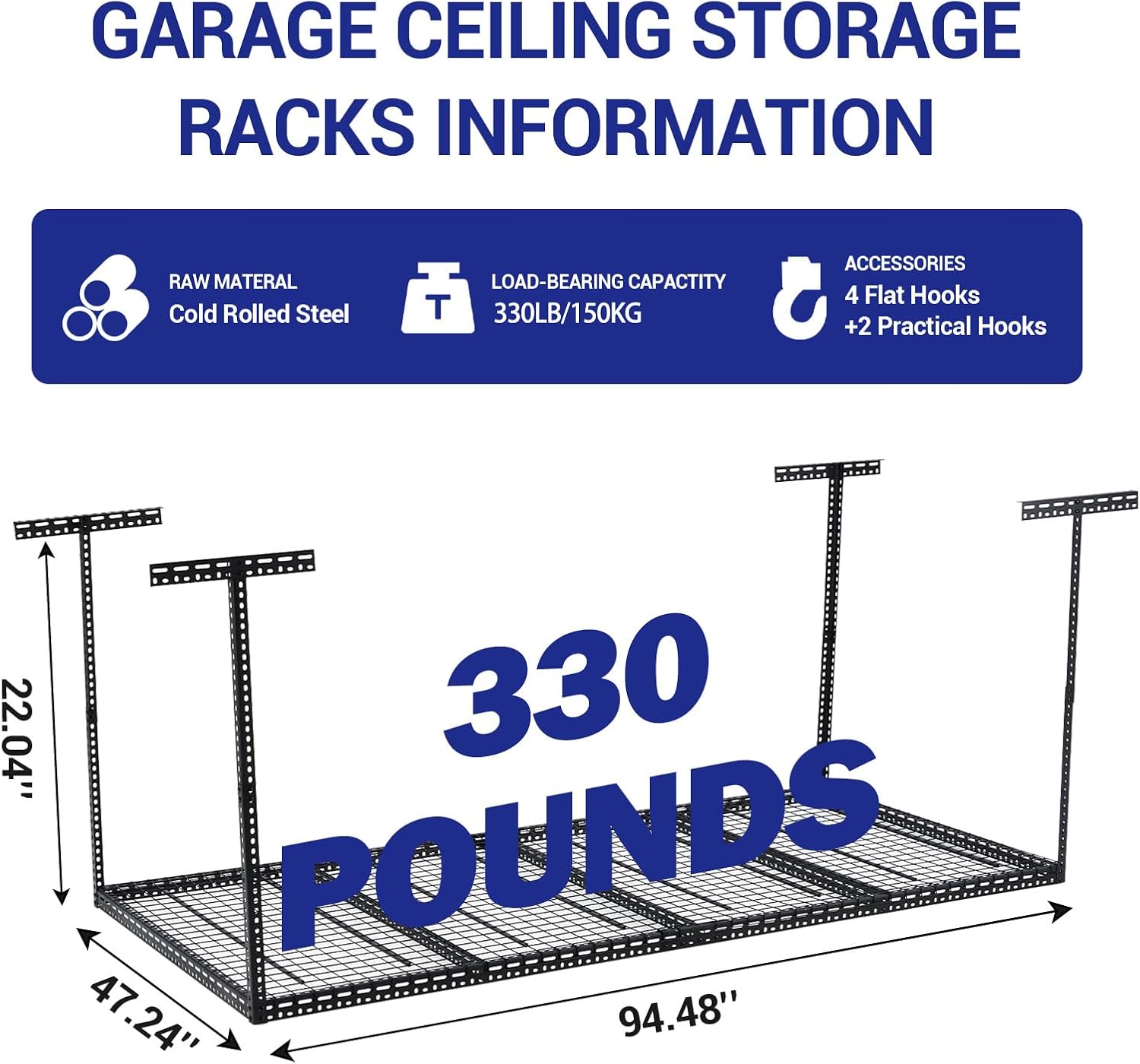 - ā Massive 105 Cu Ft Storage & Space Maximizer: Expertly utilizes wasted ceiling space (96"x48"x40") creating 105 cubic feet of organized storage. Frees up valuable garage, basement, or shed floor space by moving clutter overhead. The open grid design allows easy visibility and access to stored items.