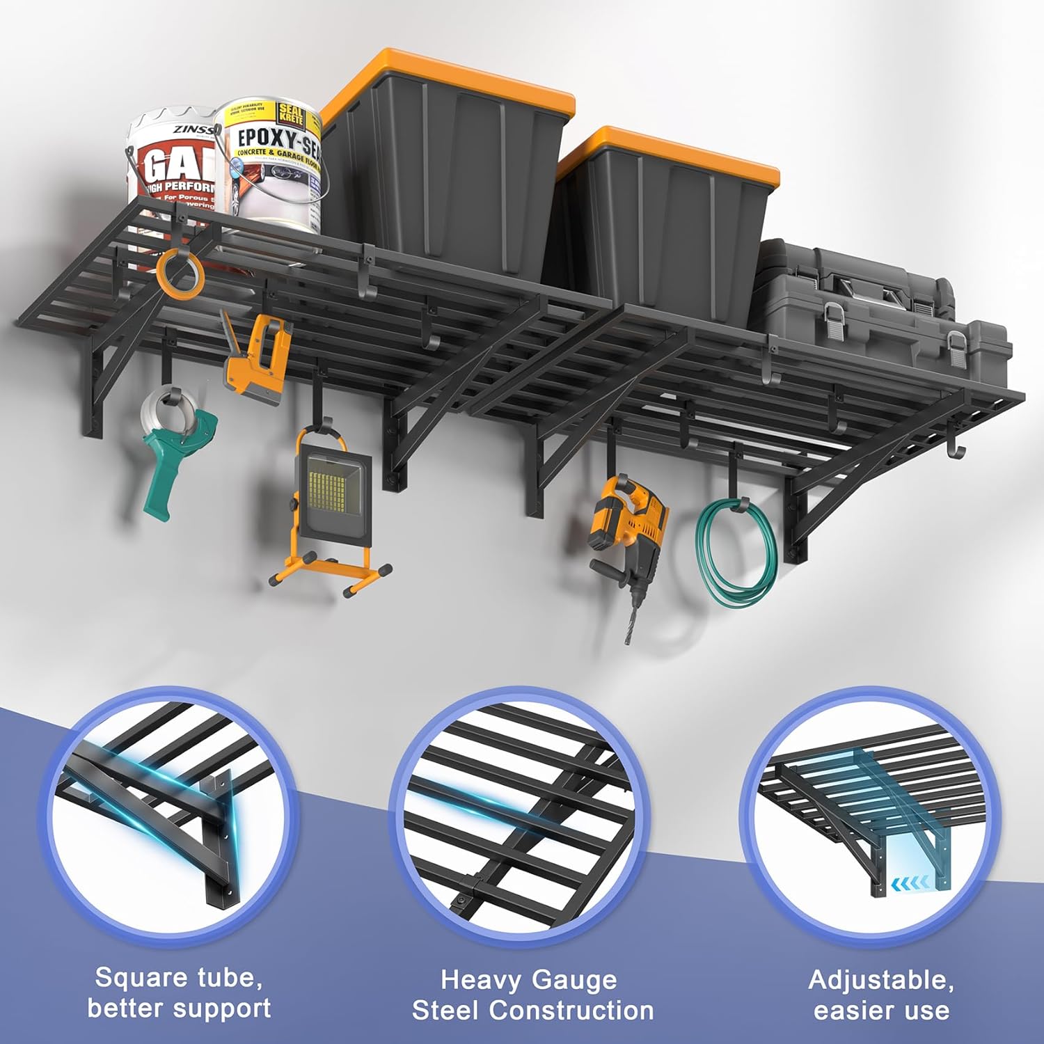 - PREMIUM STRENGTH & STABILITY: Engineered with heavy-duty steel, our wall shelf system features reinforced square tube supports, a seamless integrated frame, and secure U-hooks for superior durability. Every component undergoes rigorous quality testing to ensure maximum safety and long-lasting performance