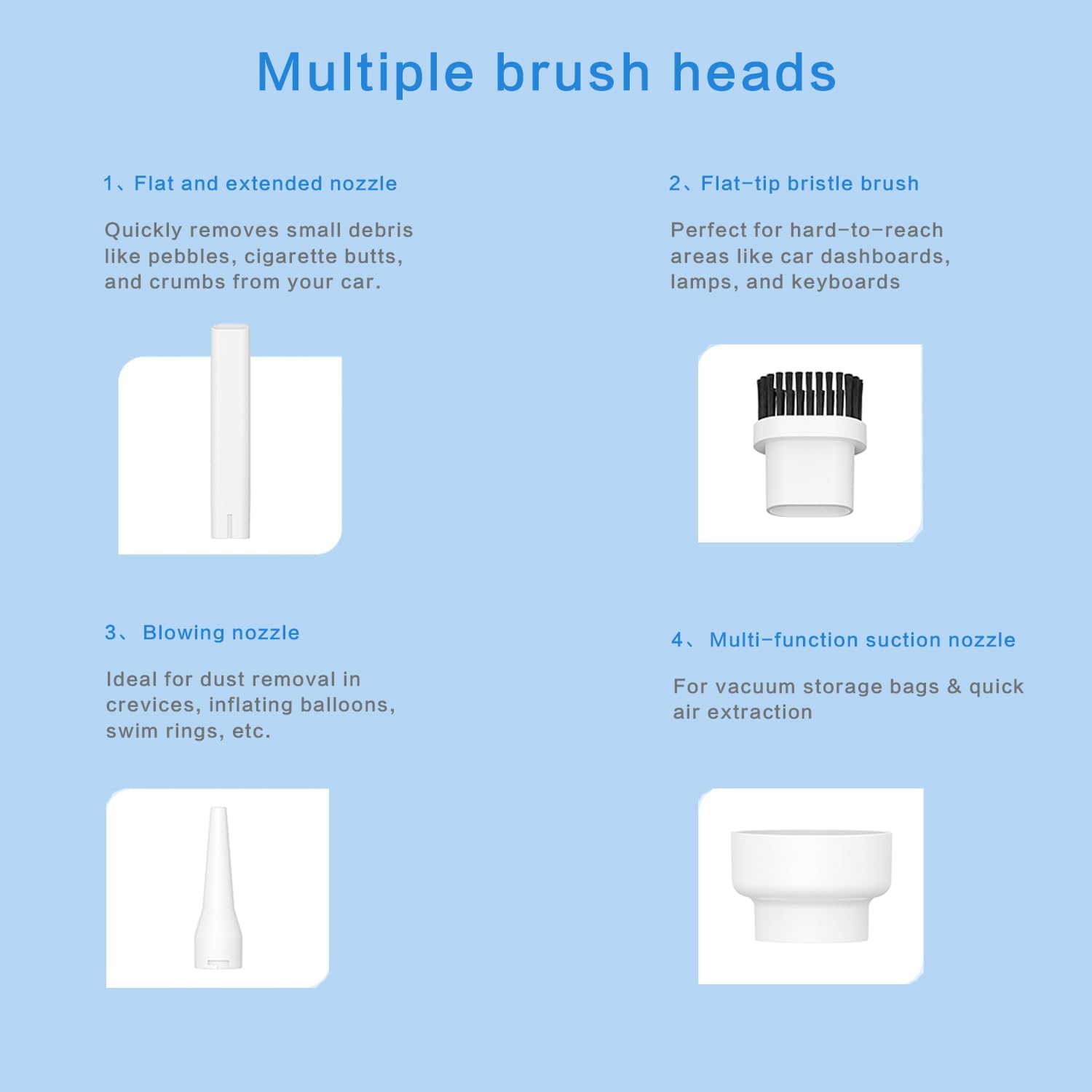 - ăMulti Functională4 attachments of hand vacuum specifically designed for vacuuming&pumping and blowing, clean the garbage in the corners and gaps, pump air from the vacuum storage bag, inflate the air cushion.