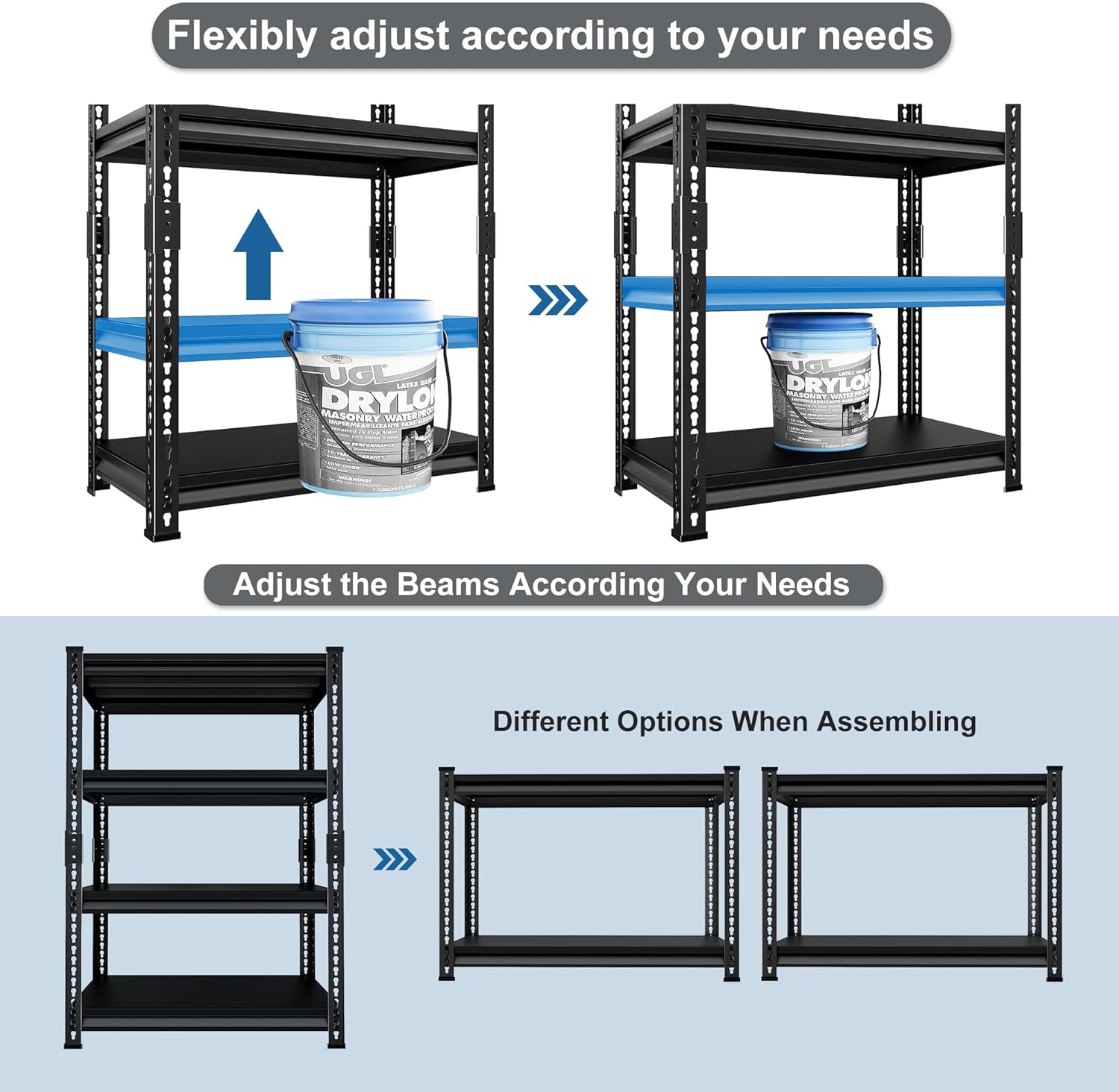 - 【Large Size Storage Shelves】Rufokisa 4-tier metal shelving unit with size of 40"W*16"D*72"H,which provides sufficient storage space and holds tons of items. It will works perfect for your garages, warehouses, basements,kitchens, pantry, basement etc .
