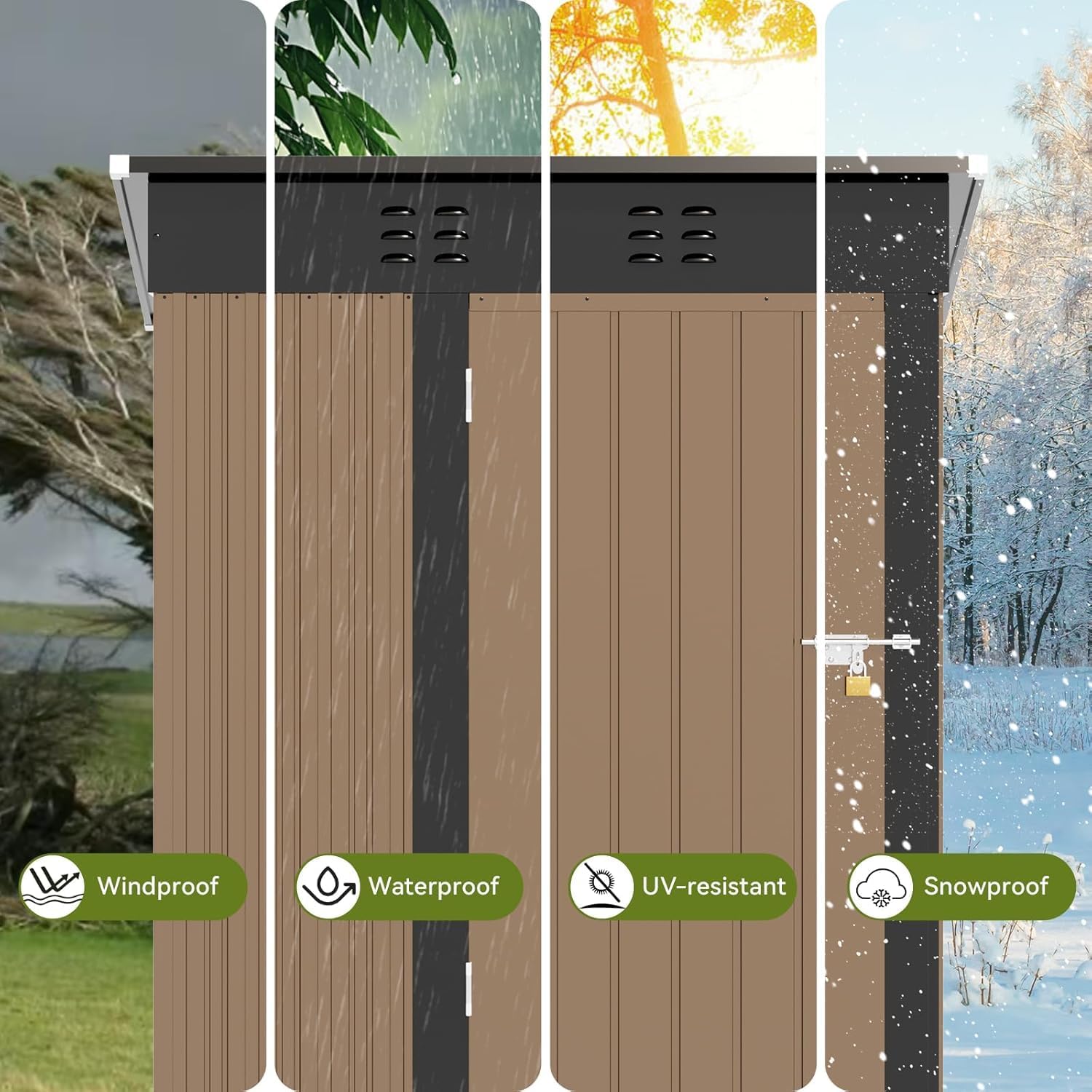 - Waterproof Tool Shed:The sloping roof design of this storage outdoor shed maximizes space utilization;effectively direct rainwater away from the structure to prevents the leakage,Don't worry about your items getting wet