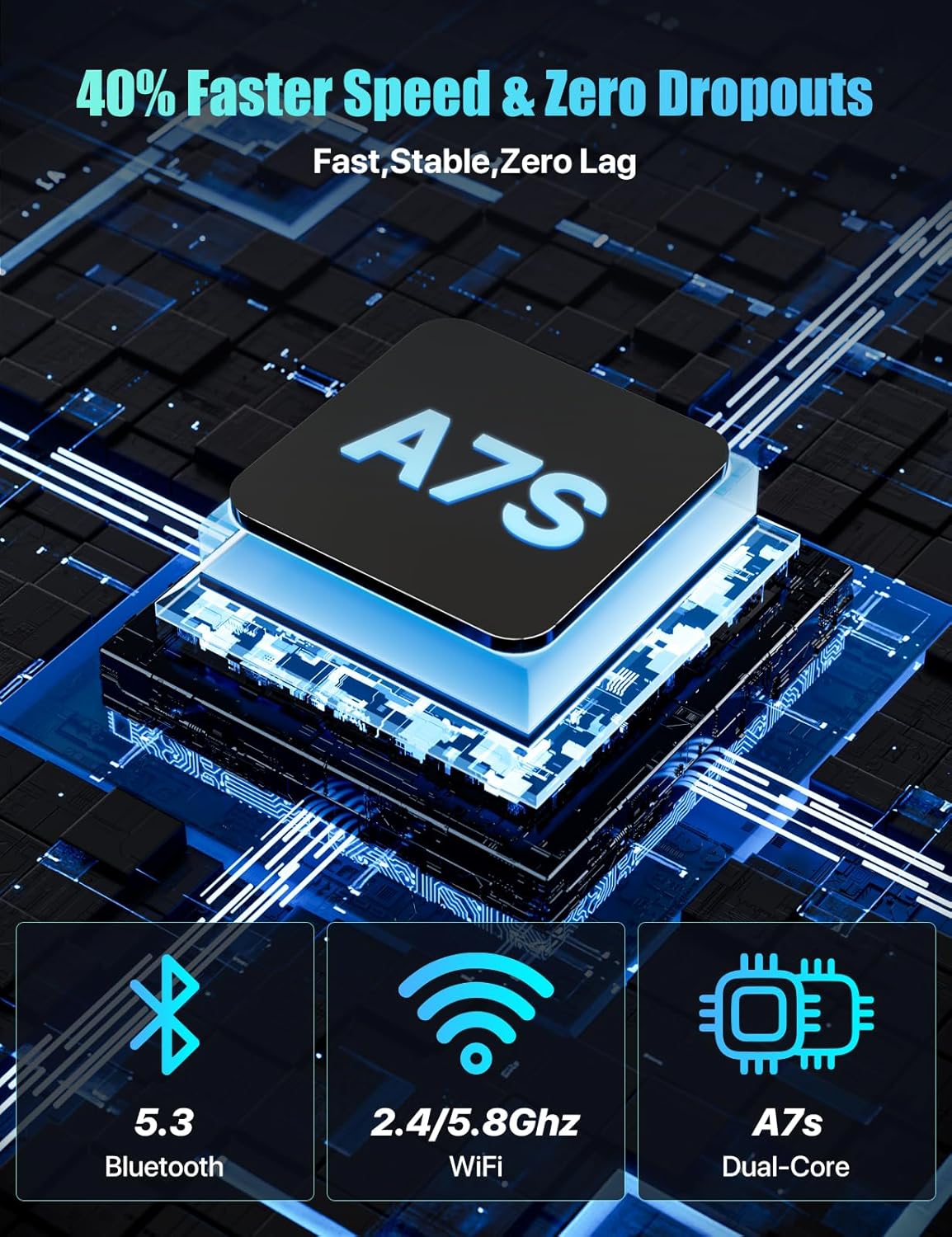 - 【Zero Lag & Speed Redefined】 Dual-Band Wi-Fi (2.4/5.8GHz) + Dual-Core A7S Chip: 40% Faster Speed & Zero Dropouts. Adaptive Frequency Hopping dynamically avoids interference for lag-free, seamless CarPlay experience.