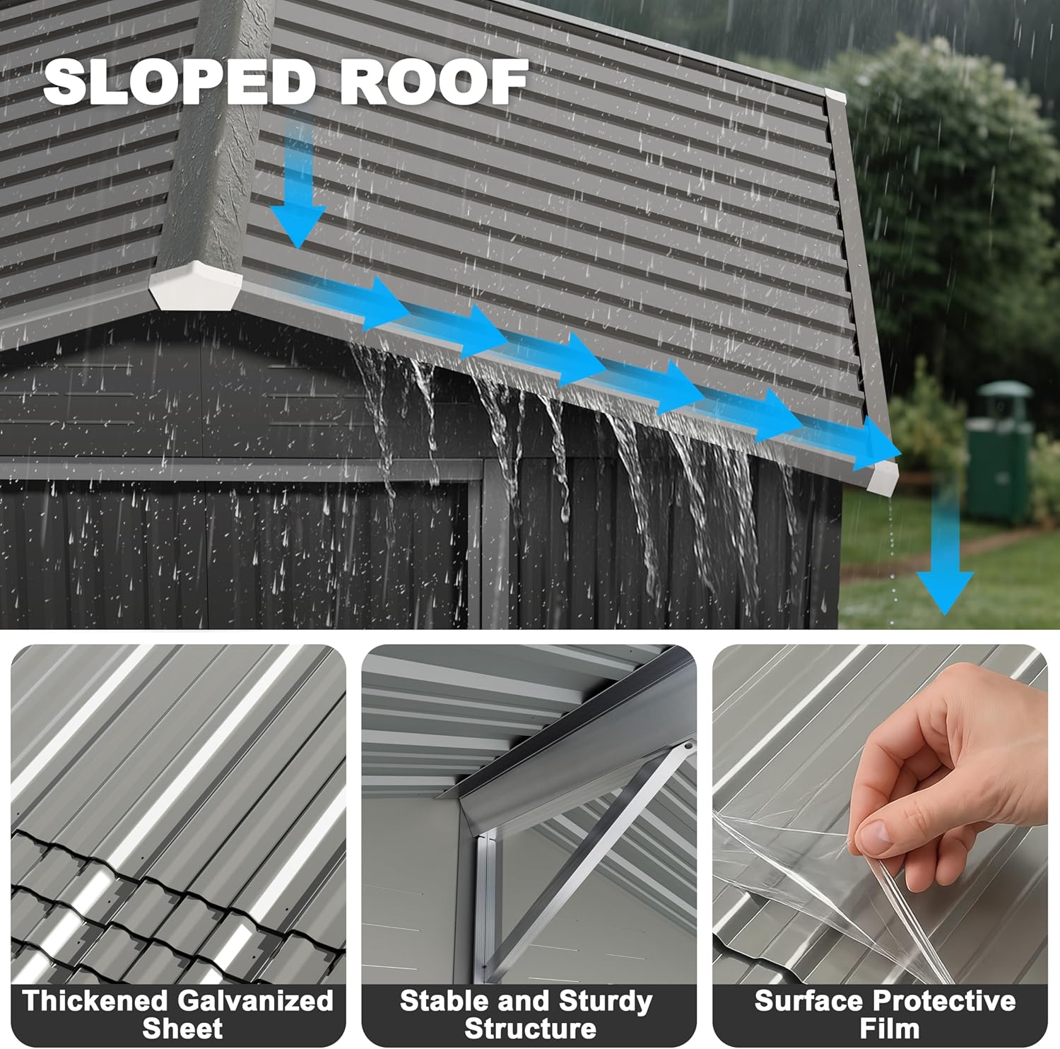 - REINFORCED STRUCTURE WITH SLOPED ROOF:The steel frame resists warping, while the 16° roof prevents water buildup. A 28.3" wide door fits most tools and mowers—great for any garden storage shed setup