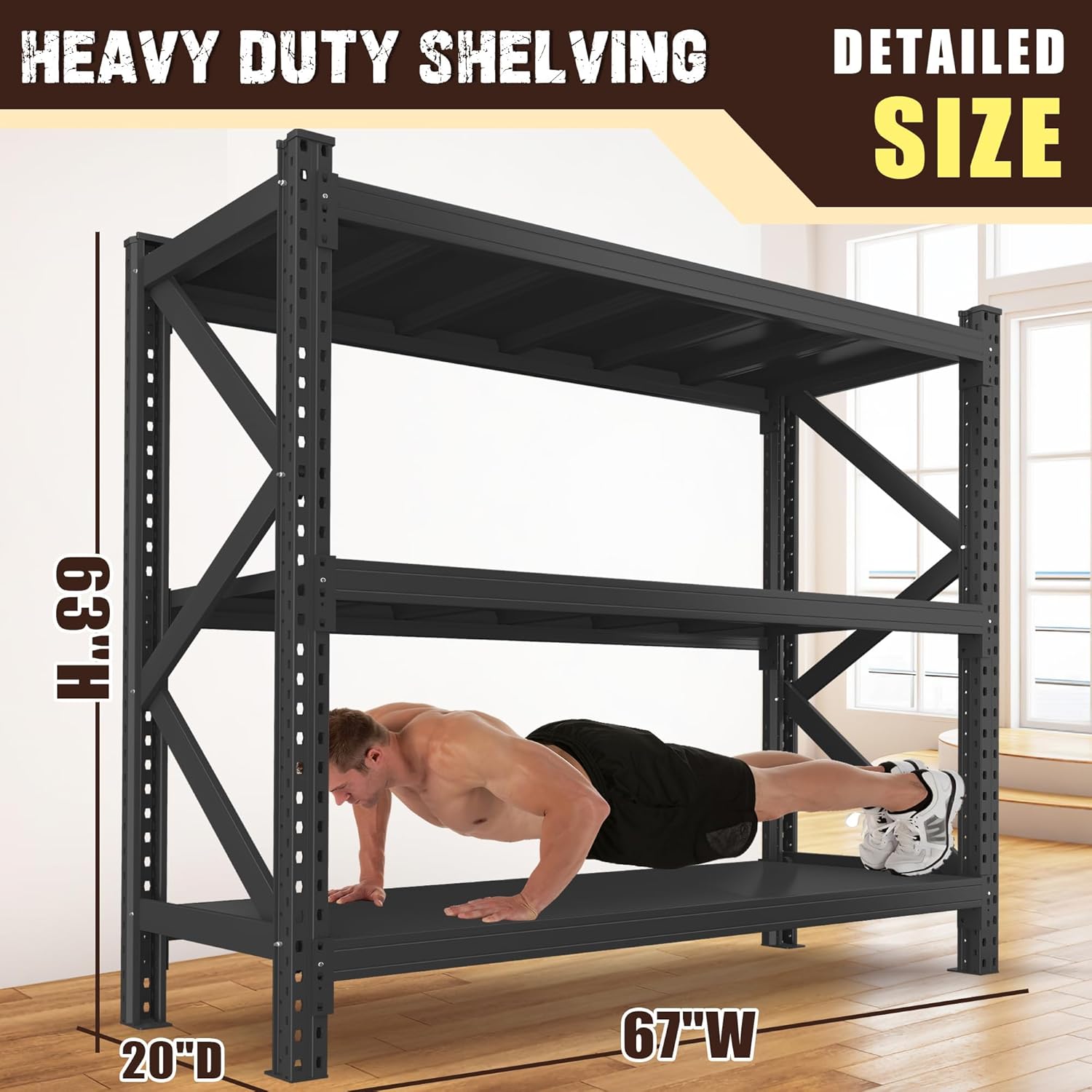 - 【Heavy duty storage shelves】This garage shelving can support up to 4200lbs and is perfect for storing heavy items, including tools, mechanical parts, and bulk storage boxes.