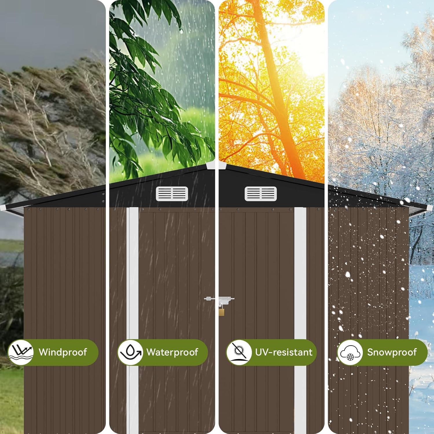 - Outdoor Shed:This storage shed is made of high-quality galvanized steel and covered with a powder-coated finish.Its durable construction ensures that it can withstand harsh weather conditions and ensure your items remain safe