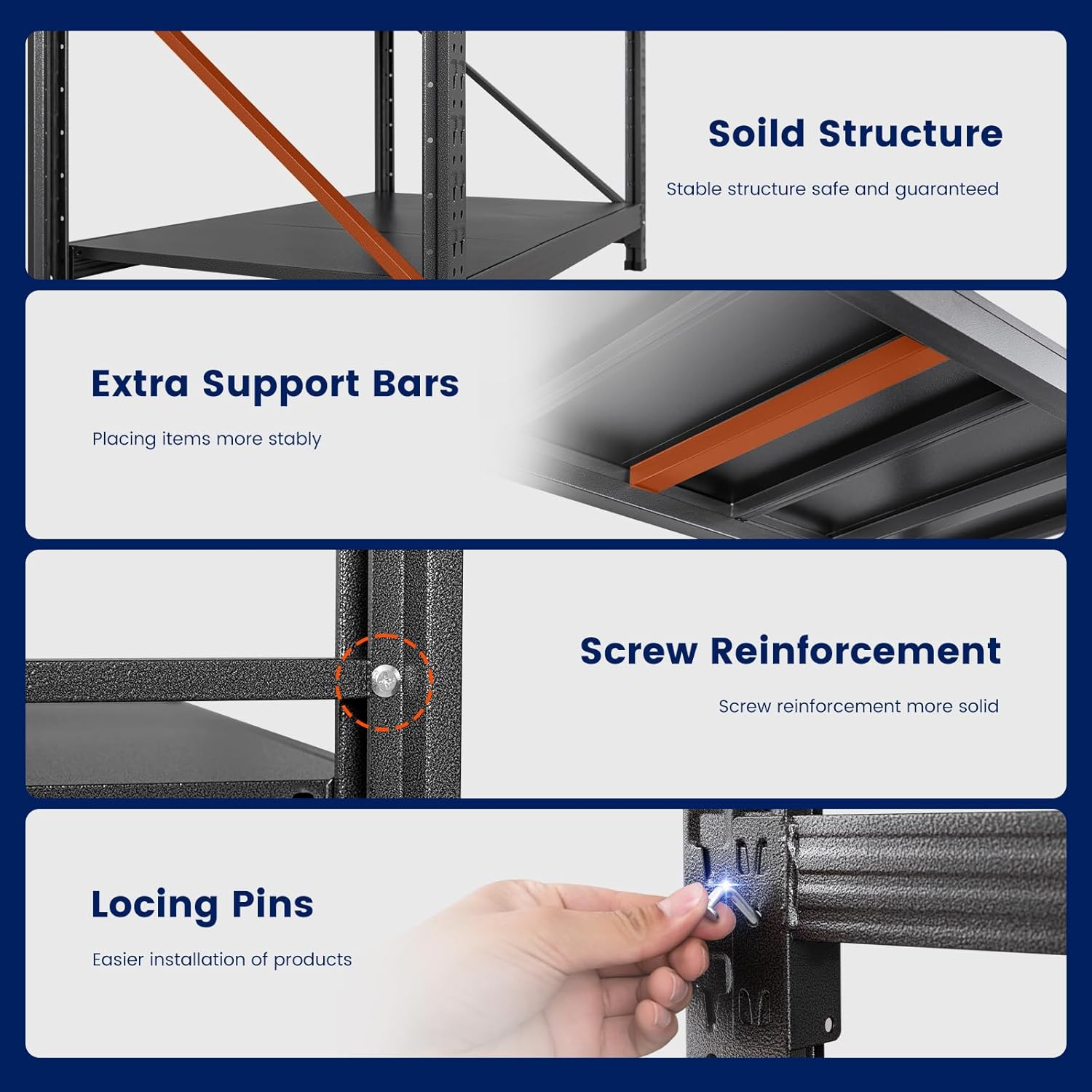 - ă 70" H Garage Shelving Heavy DutyăThis heavy-duty garage storage shelving featuring one-piece columns that are seamlessly constructed,Made of high-quality metal frame,very sturdy and enduring,each shelf can hold up to 440 lbs,treated with an anti-corrosion coating,allowing you to use the garage shelving for a long time.