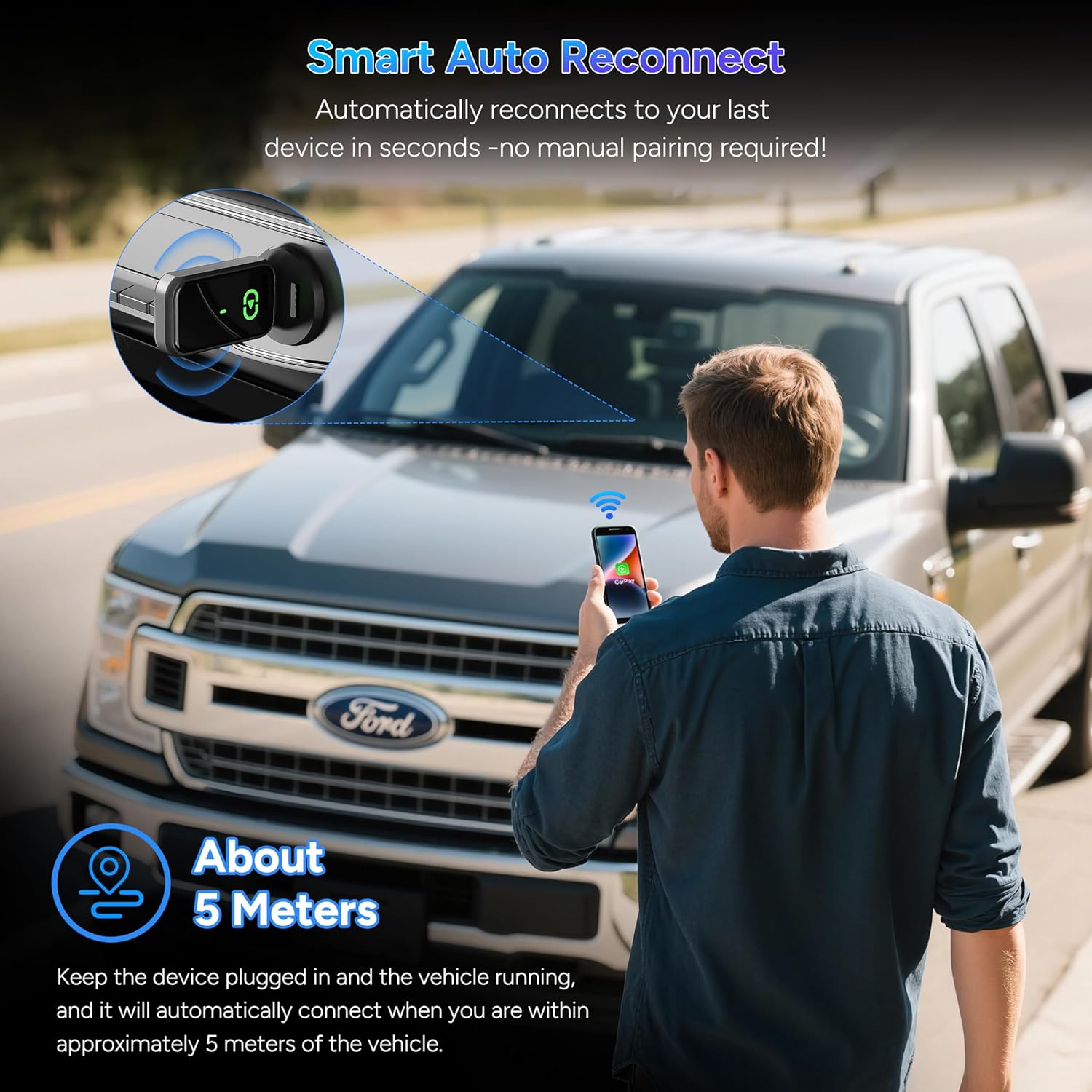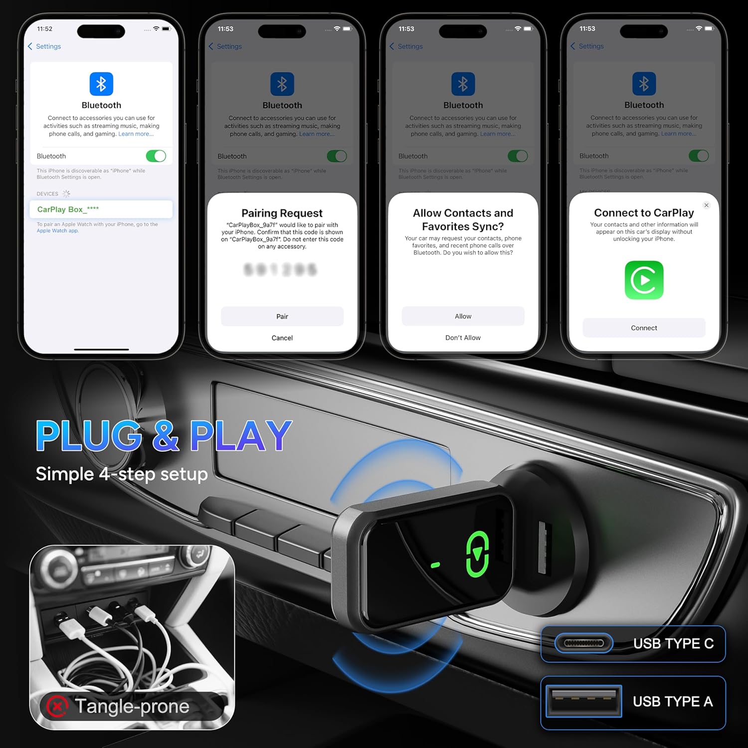 - Instant & Reliable Wireless Connection - Say goodbye to messy cables with this wireless Carplay adapter that connects instantly - just plug in, and enjoy seamless, lag-free connection in seconds. The bluetooth carplay adapter quipped with the latest Bluetooth 5.3 and WiFi 6 dual-band technology, it automatically reconnects every time you start your car, ensuring a hassle-free experience. Support Siri navigation, calls, messages, and music, giving you quick access to all your favorite features while keeping your focus on the road. Our car play wireless adapter is compatible with most 2016+ vehicles, supporting for iOS 10+ system, making future upgrades effortless and safe.