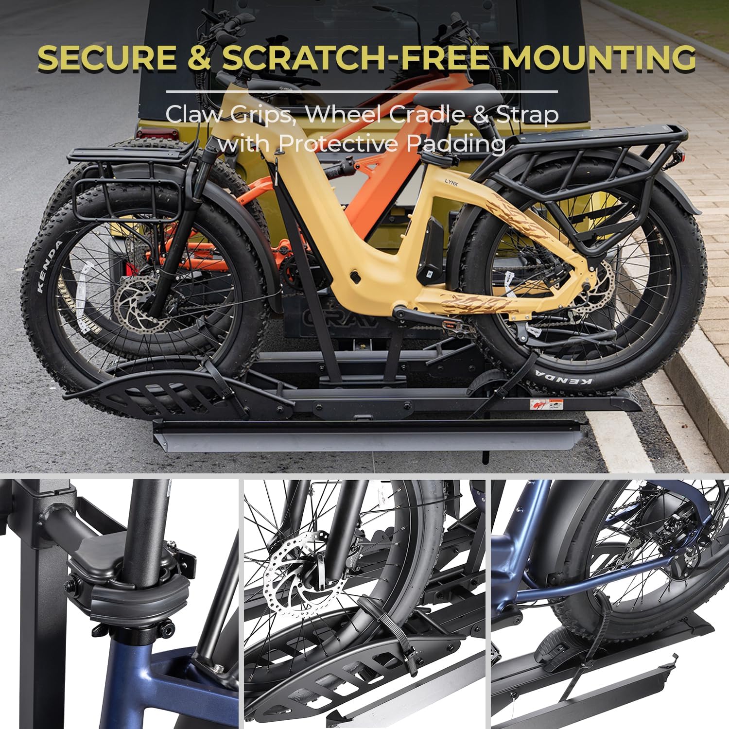 - Integrated Ramp & Secure Hitch Lock: No more lifting heavy ebikes. The CyberRack E2 features an integrated, foldable ramp that makes loading simple and safe. It also comes with a high-strength hitch lock that keeps the rack firmly secured to your vehicle, providing added protection against theft and wobble. Ideal for those needing a bike rack with ramp or ebike rack with ramp