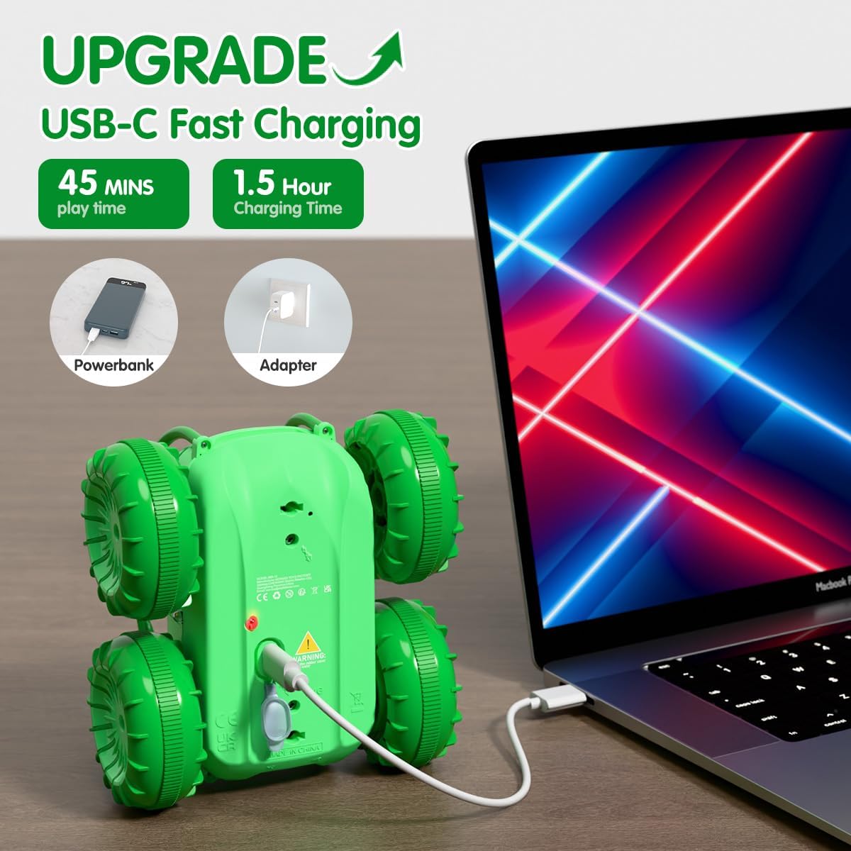 - Fast USB Type-C Direct Charging RC Cars: Built-in rechargeable battery, just plug the remote control car to the adapter can directly charge, no need to take out the battery again. Safe & Convenient. No any disassemble, ready to go anywhere.