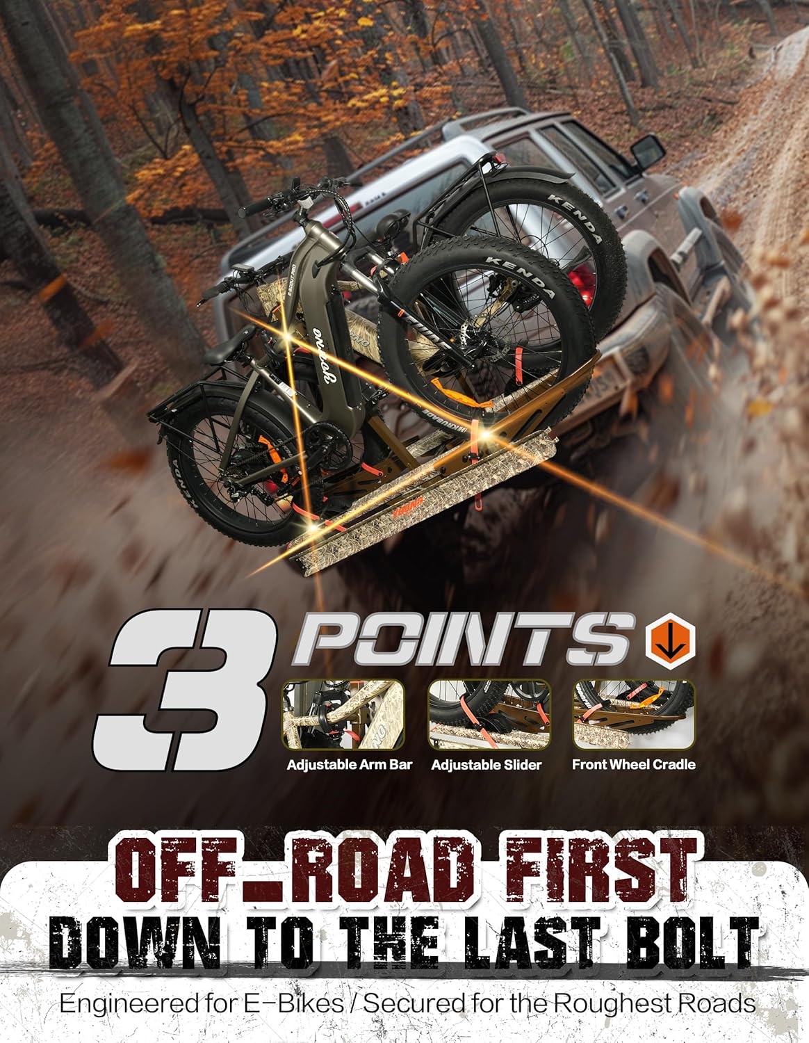 - Heavy-Duty Platform, Built for E-Bikes & Fat Tires:Carry up to 2 e-bikes, fat tire bikes, or standard bicycles—each up to 100lbs. Our heavy-duty steel frame and ultra-wide cradles accommodate tires up to 5" wide and wheelbases up to 50", making it the go-to solution for electric bike rack, fat tire bike rack, and cargo bike rack needs. Adjustable arms and sliders guarantee a secure fit for road, mountain, and hybrid bikes.