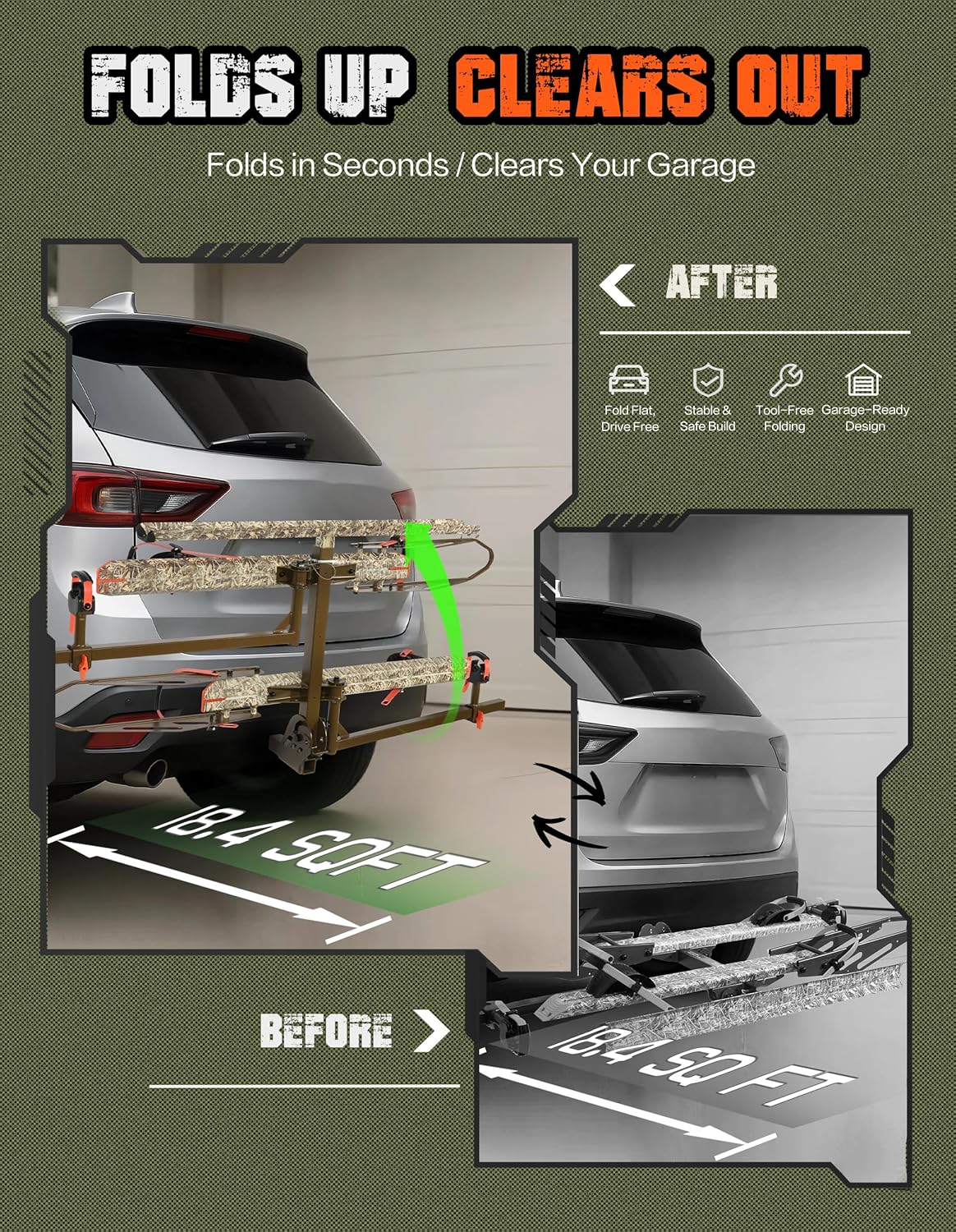 - Effortless Loading & Space-Saving Foldability: Roll bikes on and off with the built-in ramp—no heavy lifting required. The quick-release, foldable frame saves precious garage space and folds flat in seconds. Tool-free installation gets you on the road fast, while the low-profile design keeps your vehicle looking sharp, even when the rack is stored.