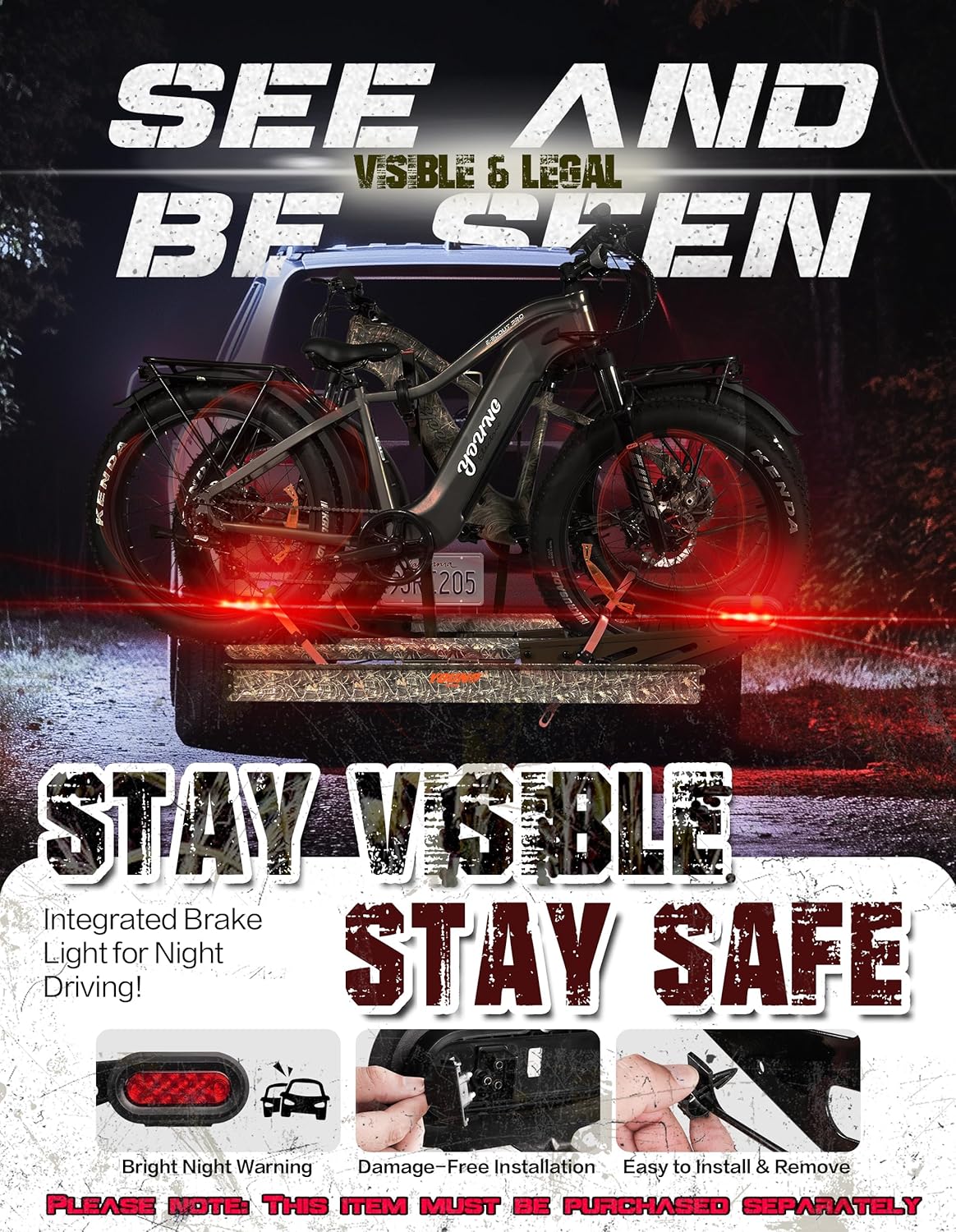 - Off-Road Tested Stability & Safety:This rack features a 3-point locking system, reinforced hitch mount, and anti-wobble tech for maximum security, even on rough terrain. Whether you’re using it as a trailer hitch bike rack, rv bike rack, or bike rack for heavy e-bike, your bikes stay safe—no rattling, no contact, no worries. FMVSS108-compatible brake light (sold separately) ensures legal, visible night driving.
