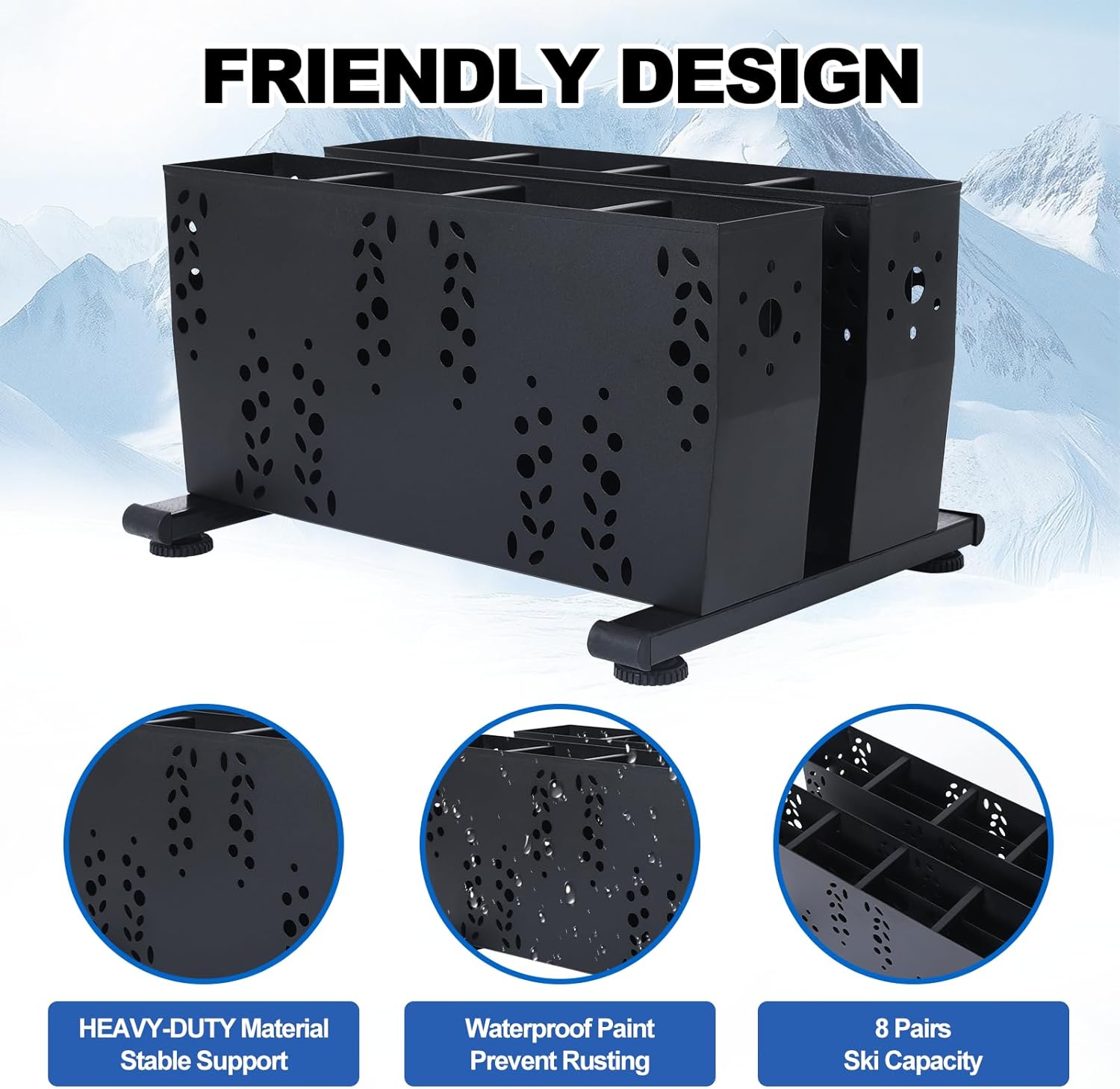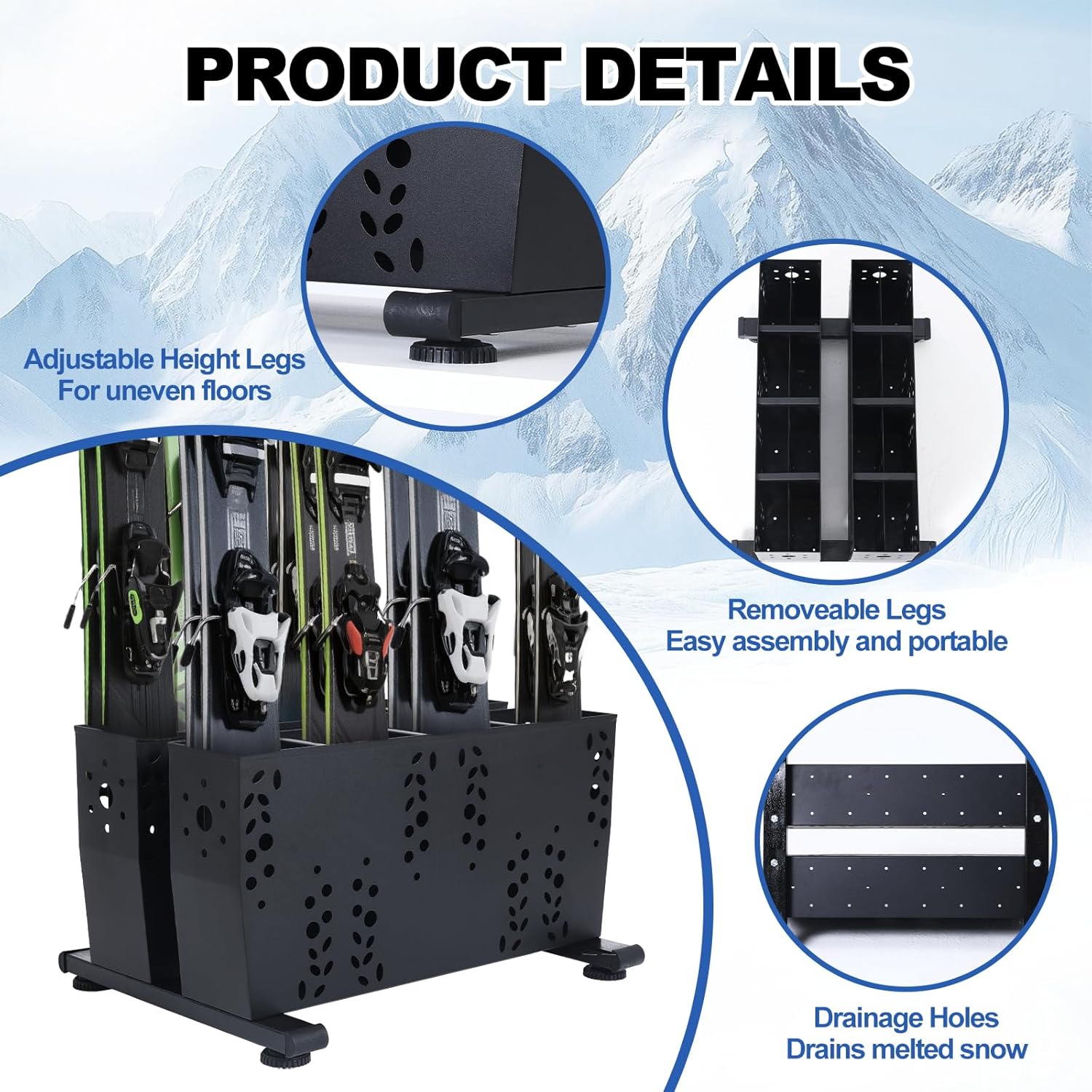 - 【FRIENDLY DESIGN】The Freestanding skis floor mount rack has the design of drainage holes, which can drain out the melt snow and protect your skis from soaking. The floor stand design ensures you can easily move it to anywhere you want.
