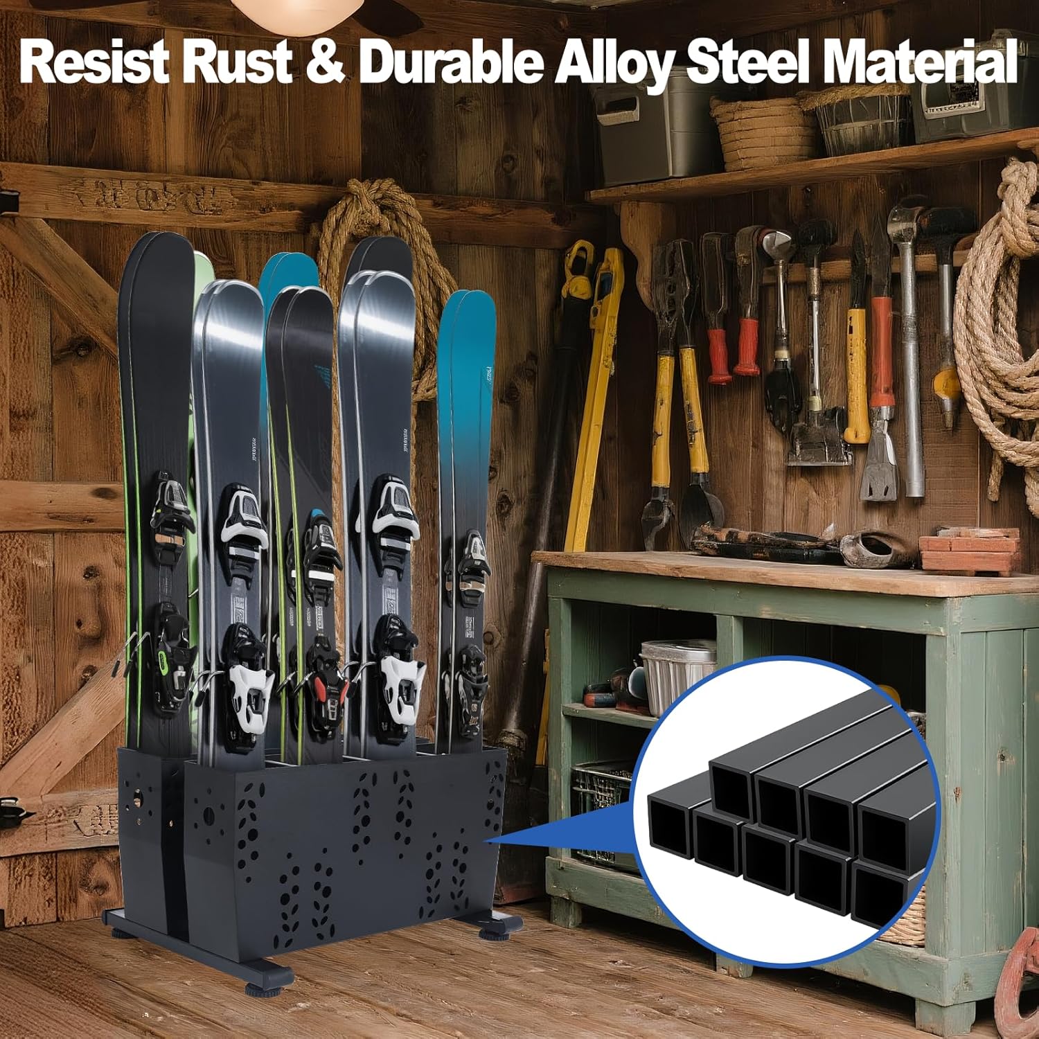 - 【STURDINESS & DURABILITY】The heavy duty ski floor storage rack is finished with powder-coated alloy steel, efficiently prevents rusting. Supports long-term use for outdoor and can withstand exposure to sunlight and soaking in rain and snow.