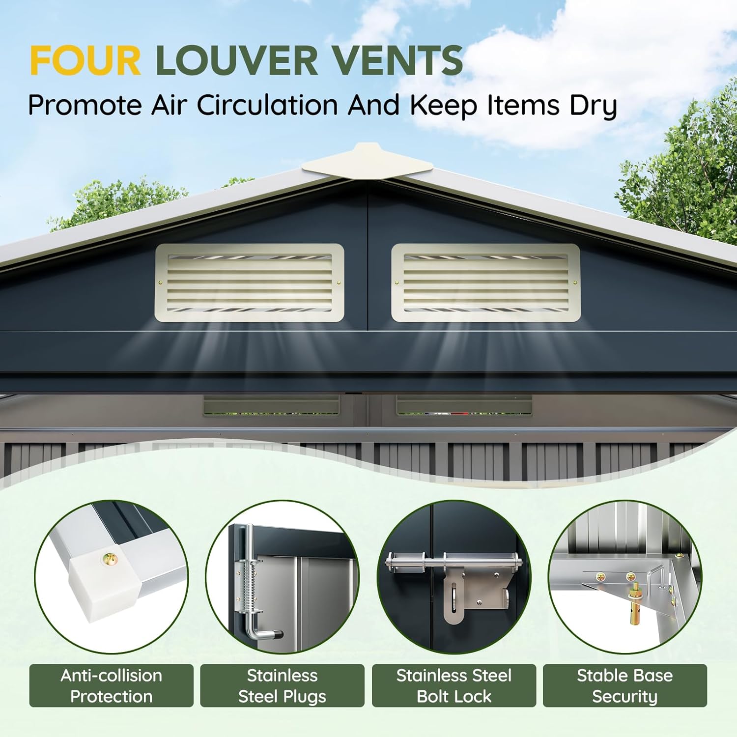 - Weather-Resistant Steel Construction – Made with galvanized steel panels that resist rust, corrosion, and UV damage, ensuring long-lasting durability in all weather conditions.