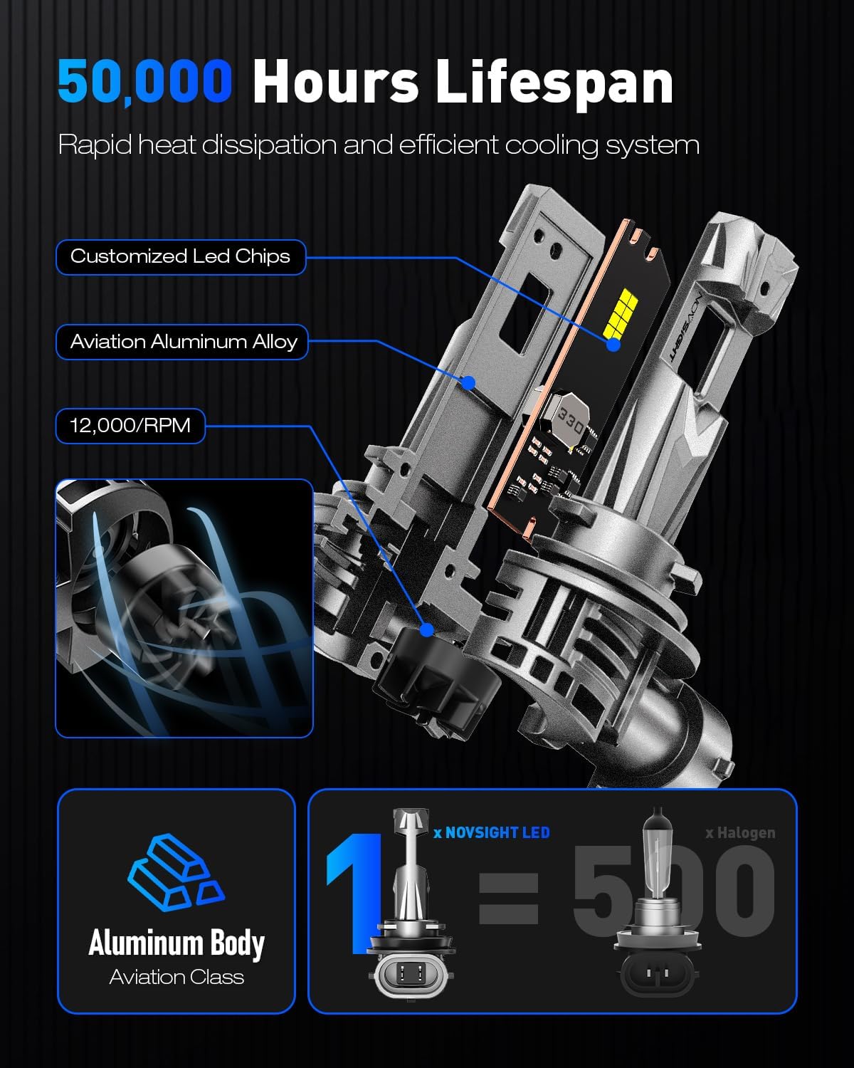 - ăEfficient Heat Dissipationă Advanced cooling keeps temps lower than halogen, extending bulb life to 50,000 hours. Reduce replacements, save costs, and ensure long - term reliable lighting