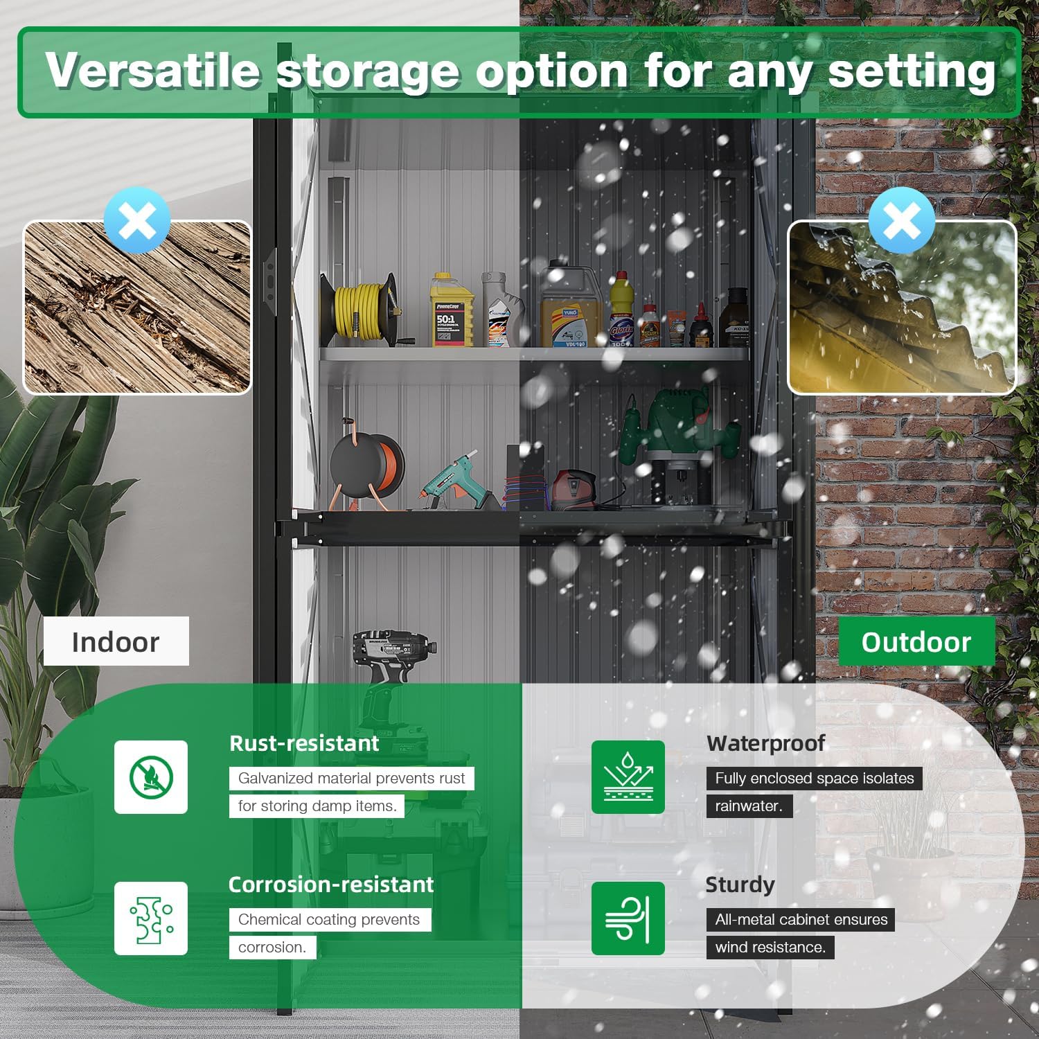 - Weatherproof Outdoor Cabinet: Fully sealed for outdoor storage waterproof protection and made from high-quality metal, weighing 95 lbs and capable of withstanding strong winds. It combines the benefits of traditional wooden and resin sheds, making it suitable for both indoor and outdoor use.