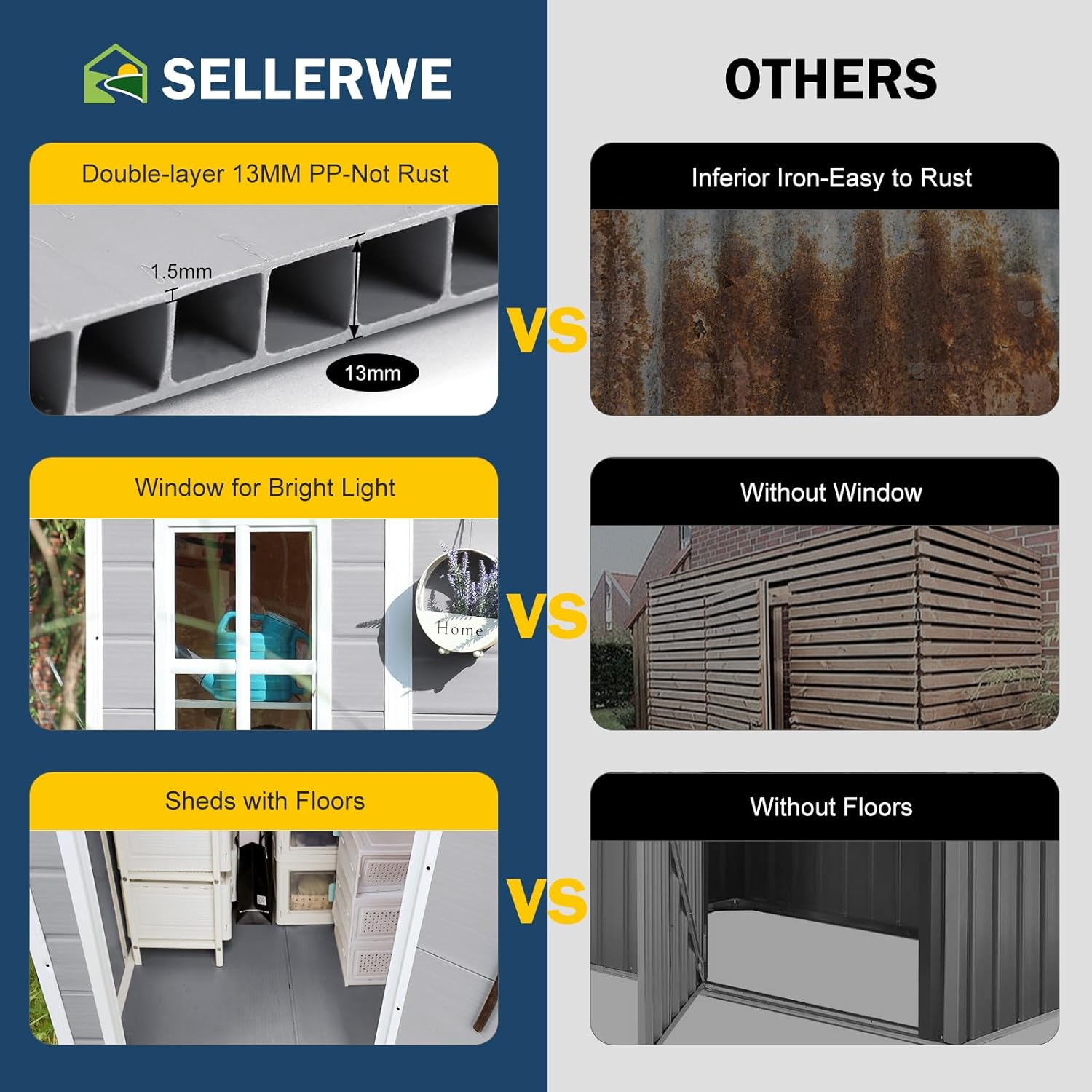 - π‘[PREMIUM MATERIAL STORAGE SHED WITH FLOOR]: The 12mm tough double-wall resin construction and impact-resistant floor are designed for long-term durability. The double-wall panels are waterproof and moisture-proof, allowing worry-free use in all weather conditions. It is weather-resistant, waterproof, and UV-resistantβno peeling, rotting, or rusting. The screws are embedded to ensure aesthetics and safety.