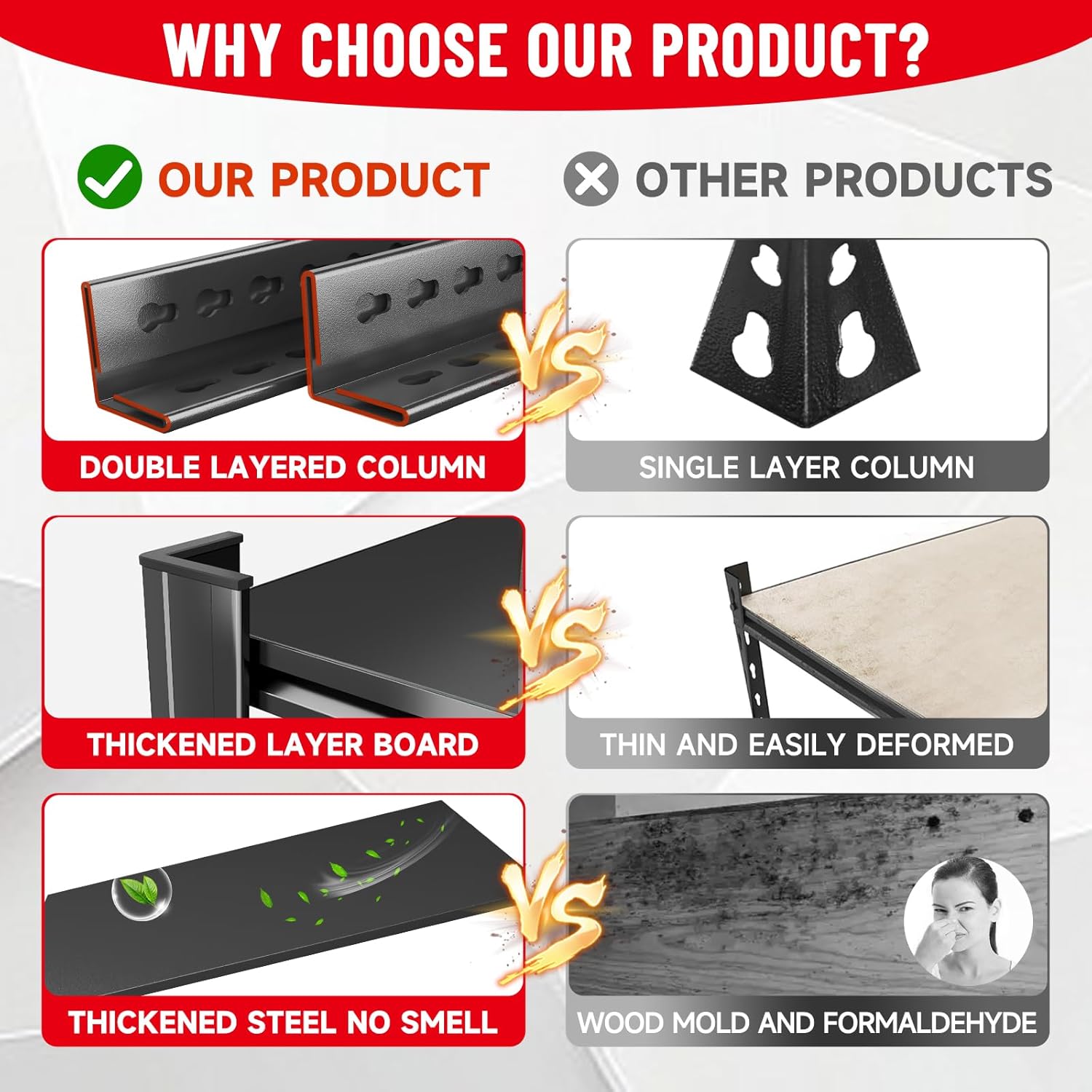 - 【Thickened steel load capacity up to 3500LBS】 This garage shelving is made of high-quality thickened cold-rolled steel, with a load-bearing capacity that is 30% thicker than ordinary steel. Double layered column design has stronger load-bearing capacity compared to single-layer columns, with a maximum load-bearing capacity of 3800LBS and a single-layer load-bearing capacity of 760LBS