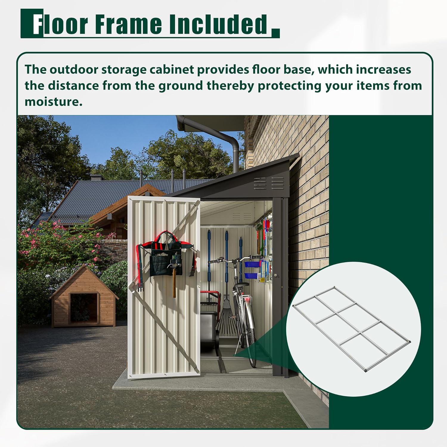 - Foundation and Vents: It also has a base, which enhances stability by itself or keeps the space clean and sealed as a floor with the help of some wood boards. Our garden tool shed features two air vents on the front and rear, which keep the interior cool and mitigate musty smells