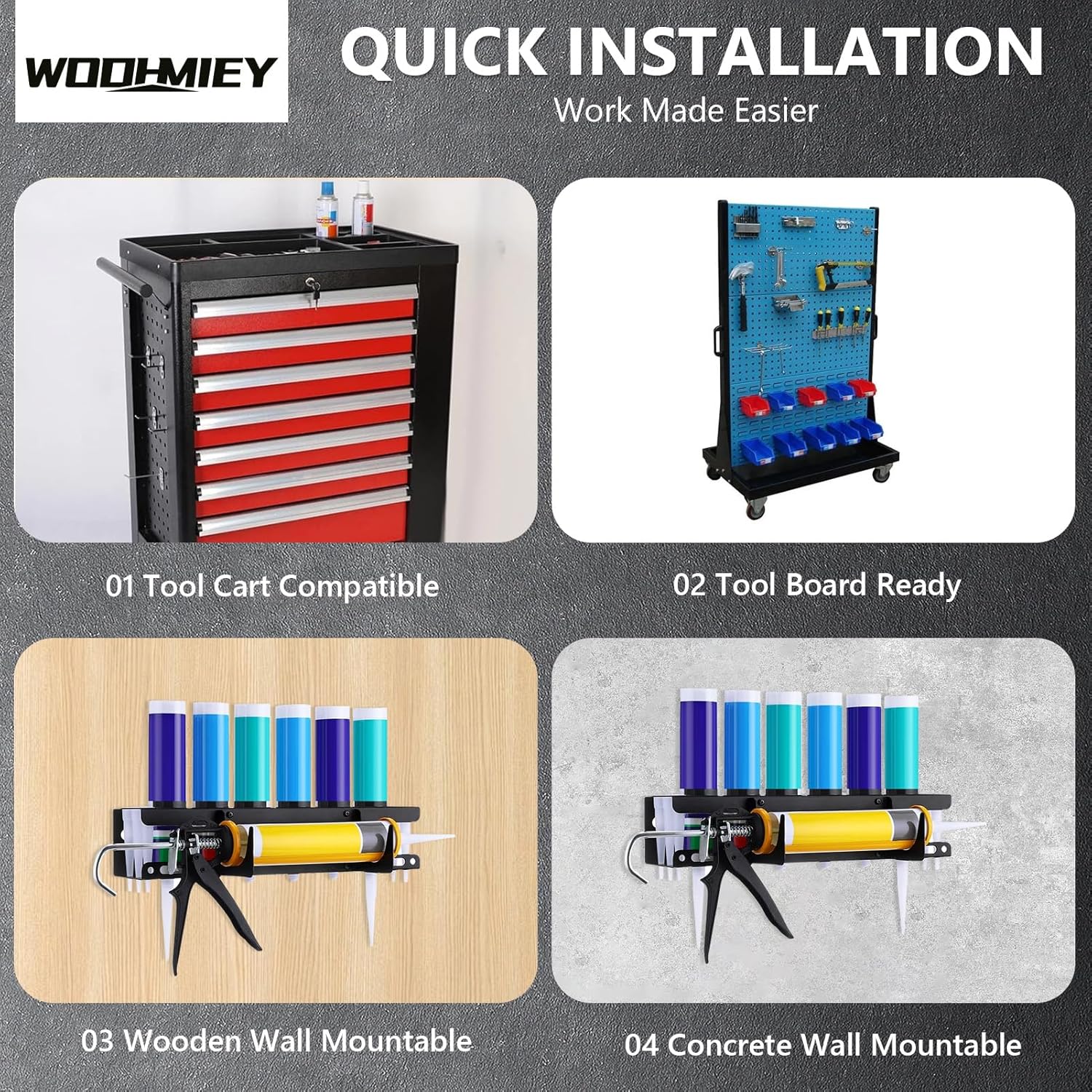 - [Smart Storage Design] Featuring precision engineered slots this organizer holds up to 6 caulk tubes and 6 nozzles securely. the specially designed cutouts accommodate various tool sizes ensuring compatibility with most standard caulking products. keep all your sealing supplies neatly arranged and within easy reach.