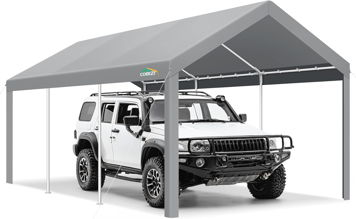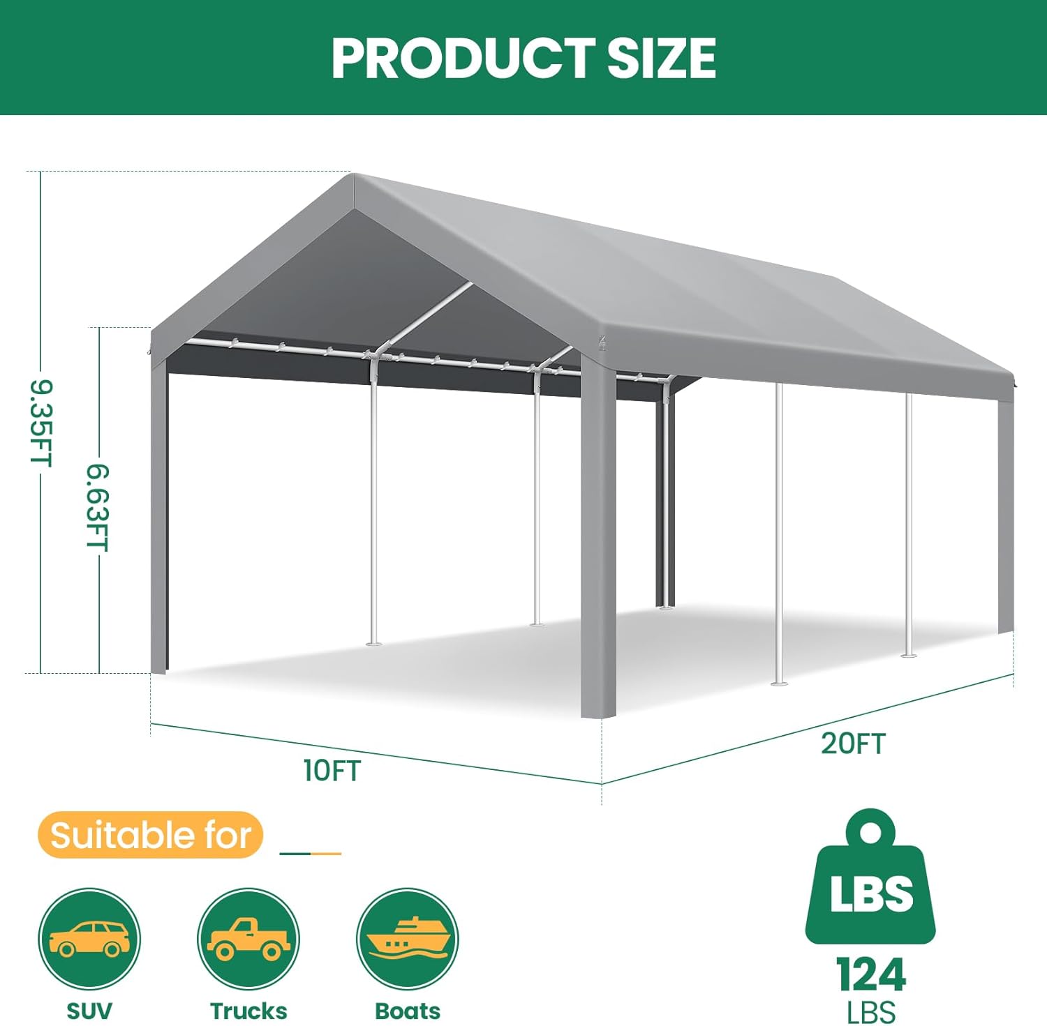 - 【Heavy Duty Structure】 10x20 carports feature a rust-resistant powder-coated steel frame, preventing chipping, peeling, rust, and corrosion. With 8 solid legs made of 1.5-inch galvanized steel pipes, this structure ensures enhanced safety and stability.