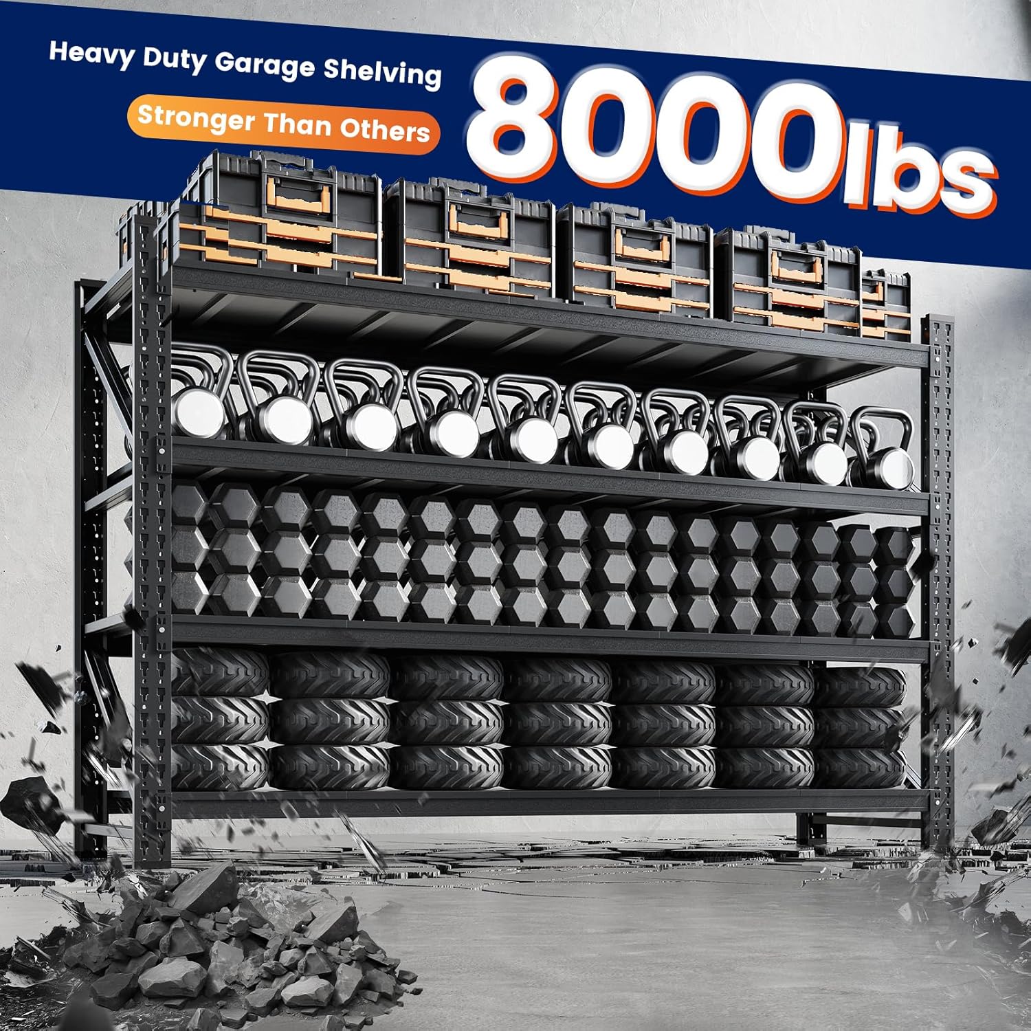 - ăSturdy DesignăThe garage shlelving units reinforced diagonal braces designs,its could evenly distribute the weight,features reinforcing ribs for added strength,ensuring strong stability and resistance to deformation.