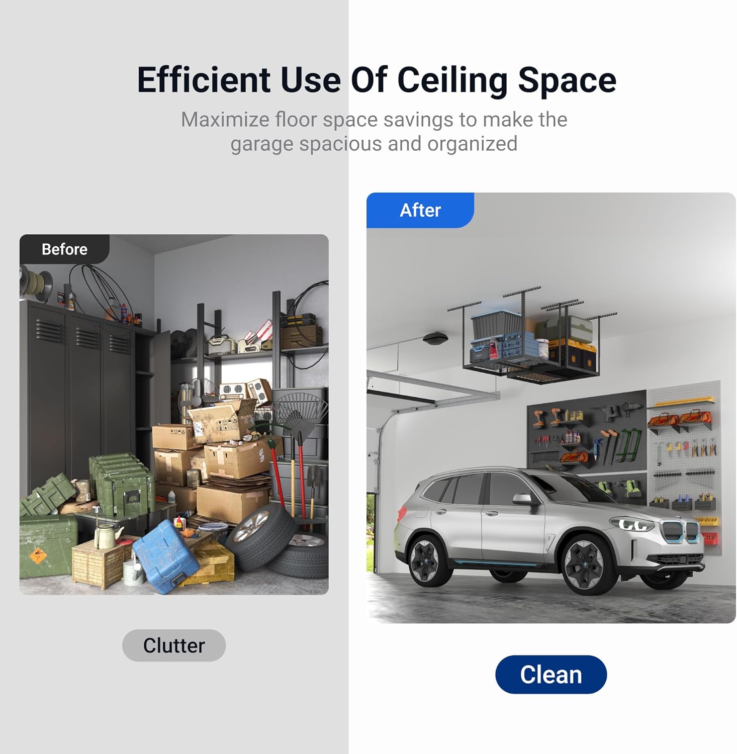 - 310 lbs Tested, 155 lbs Rated: Our overhead garage storage rack undergoes rigorous double load testing (310 lbs) to ensure unmatched safety and durability, supporting up to 155 lbs for your tools and equipment.