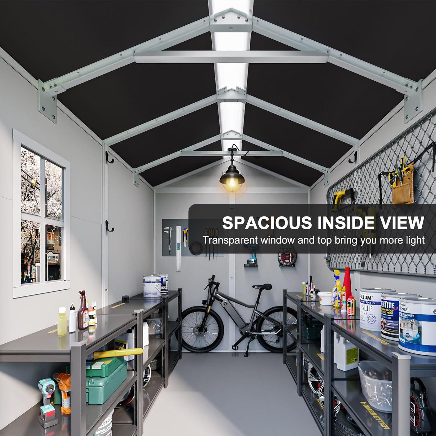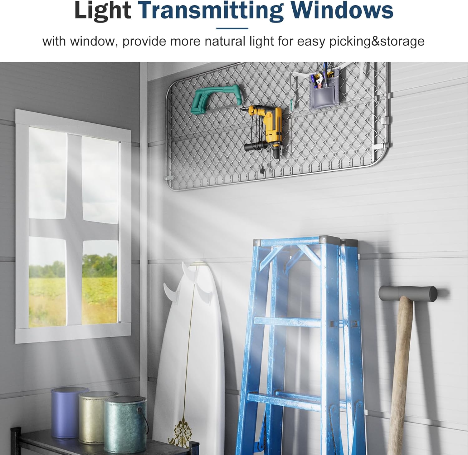 - 【Practical Design】This outdoor waterproof storage shed features a sloping roof, preventing water accumulation. The lockable door enhances security and prevents accidental entry of small animals. T-holes in the side frame allow hooks to hang something like baskets and ponchos. The vents, window and the top reflector design provides plenty of natural light and ventilation. It allows the visibility of tools from the outside and enhances the aesthetics of the shed